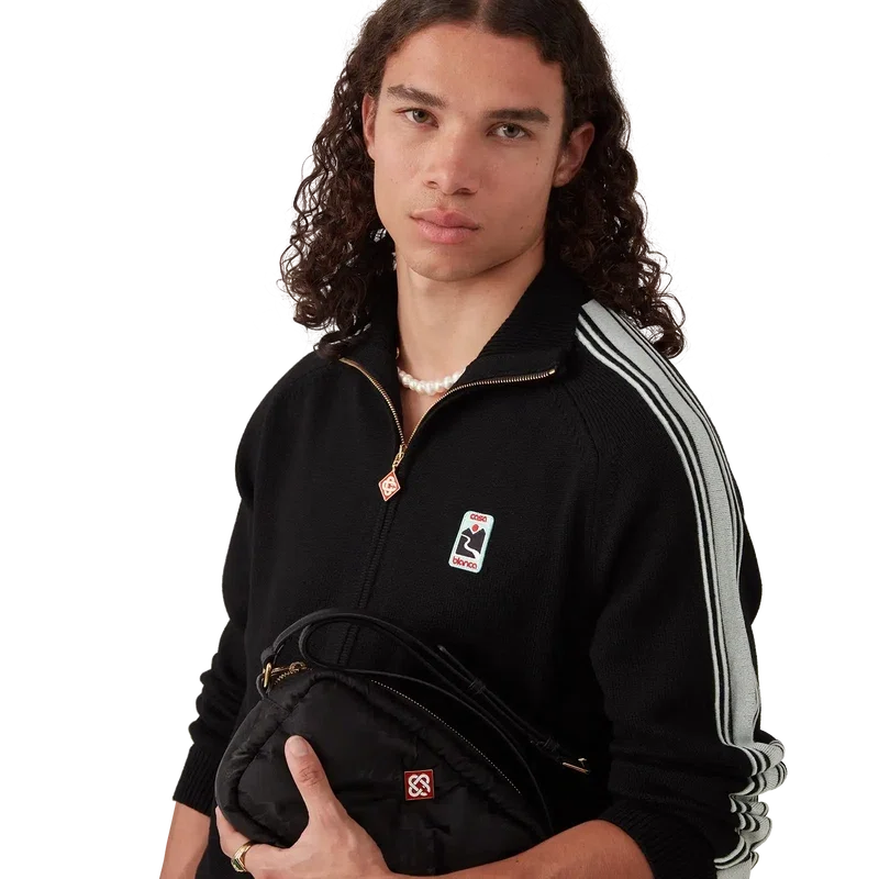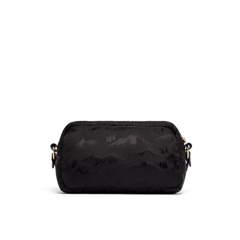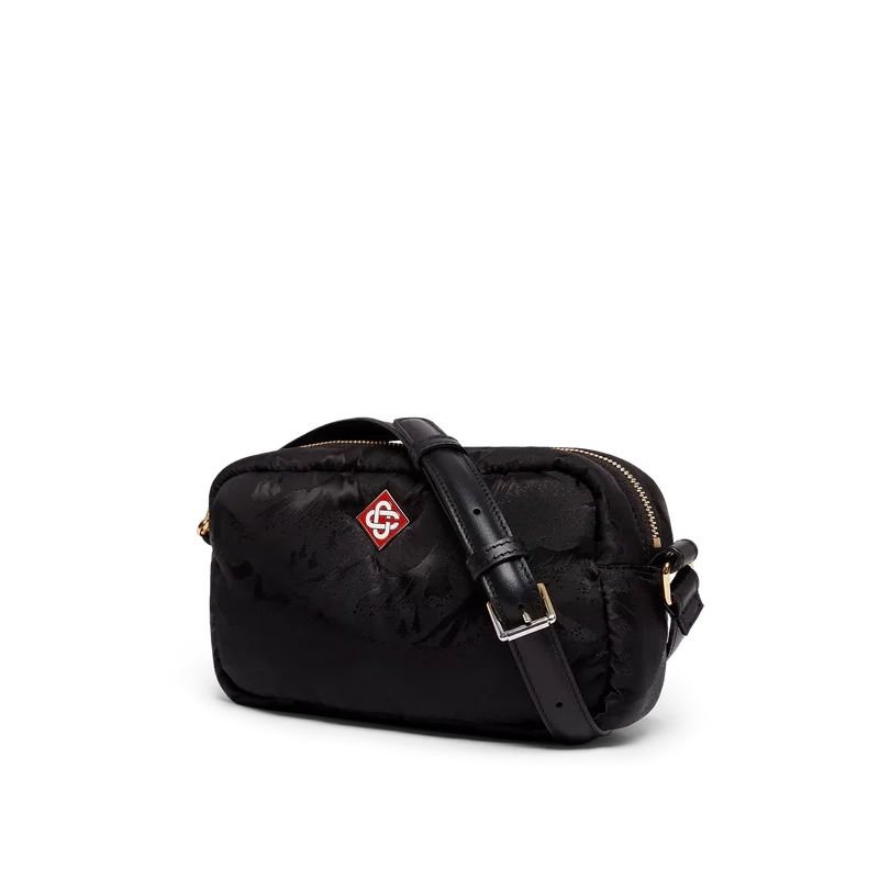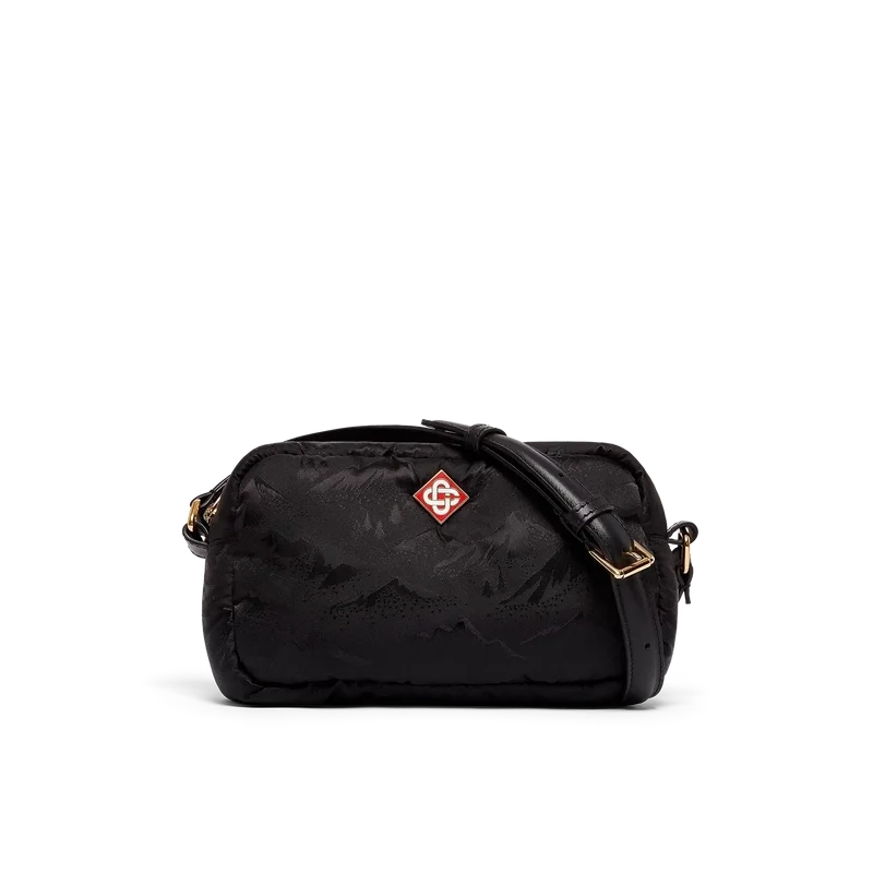 Die schwarze Kameratasche ist aus technischem Gewebe gefertigt und mit dem Jacquard-Bergmuster dieser Saison versehen. Abgerundet wird sie durch einen verstellbaren Schulterriemen aus Leder, einen Reißverschluss und das charakteristische Rautenlogo des Hauses.