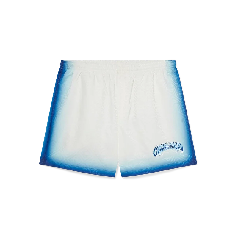 Die Blue Fade Shorts sind ein bedrucktes Design mit dem Casablanca-Logo des Hauses in einer handgezeichneten Typografie, die von der in Tattoos verwendeten gotischen Schriftart inspiriert ist. Sie sind aus Polyester gefertigt und verfügen über einen elastischen Bund, einen innenliegenden Kordelzug, Seitentaschen in den Nähten, ein Futter und eine Innentasche.