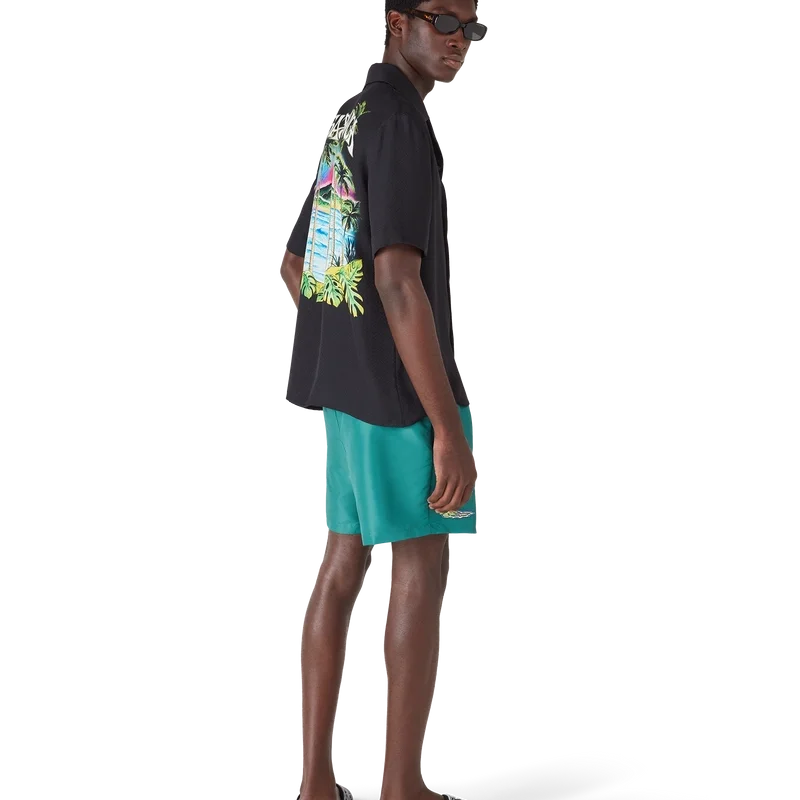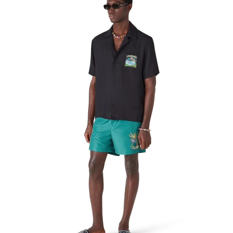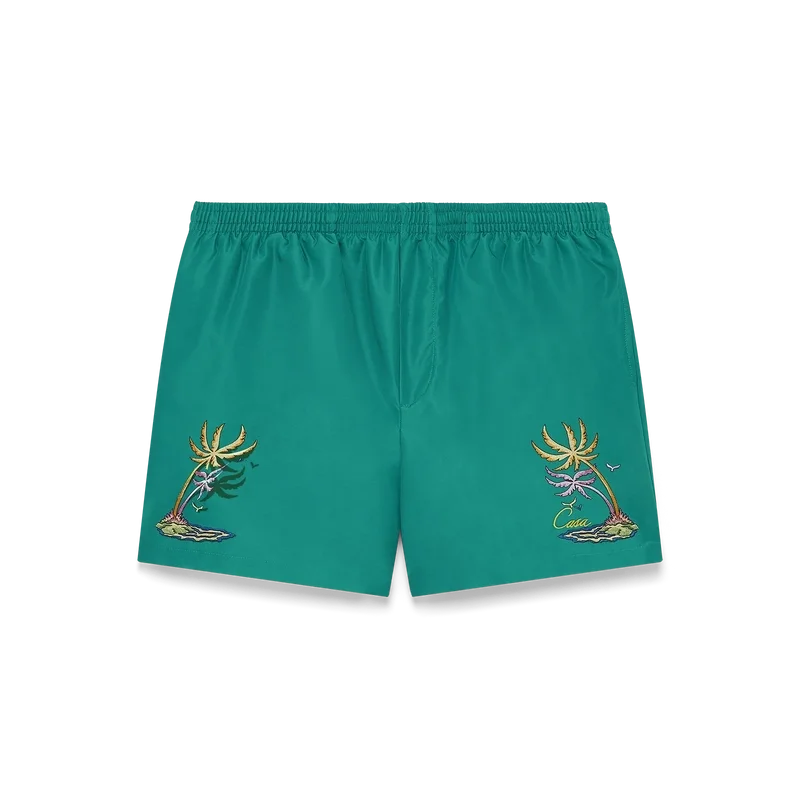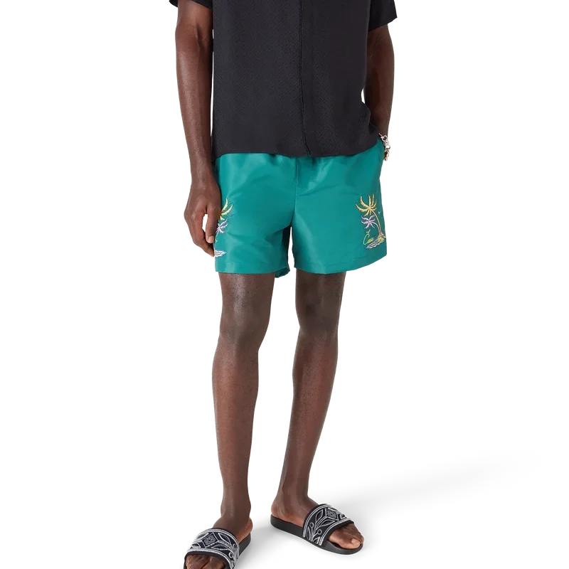 Die Casa Embroidery Shorts zeigen farbenfrohe Palmen, die im Meereswind tanzen, dargestellt durch präzise Stickereien, die die rhythmische Bewegung tropischer Blätter einfangen. Abgerundet durch einen elastischen Bund, Seitentaschen und eine Konstruktion aus technischem Badematerial, die den raffinierten Ansatz des Hauses für luxuriöse Bademode verkörpert.