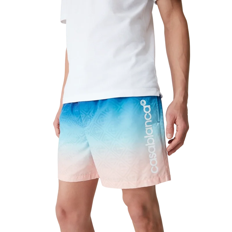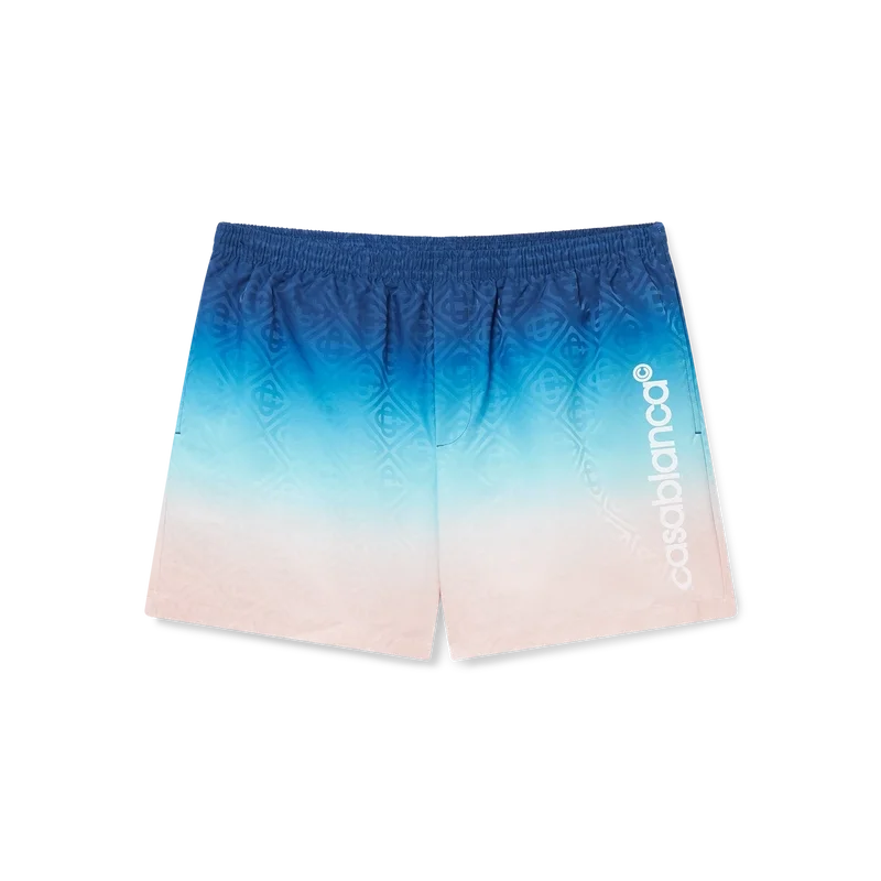 Die Jacquard Gradient Badeshorts sind ein rundum bedrucktes Modell aus Polyestergewebe. Mit elastischem Bund mit innenliegendem Kordelzug, Eingrifftaschen und Futter.