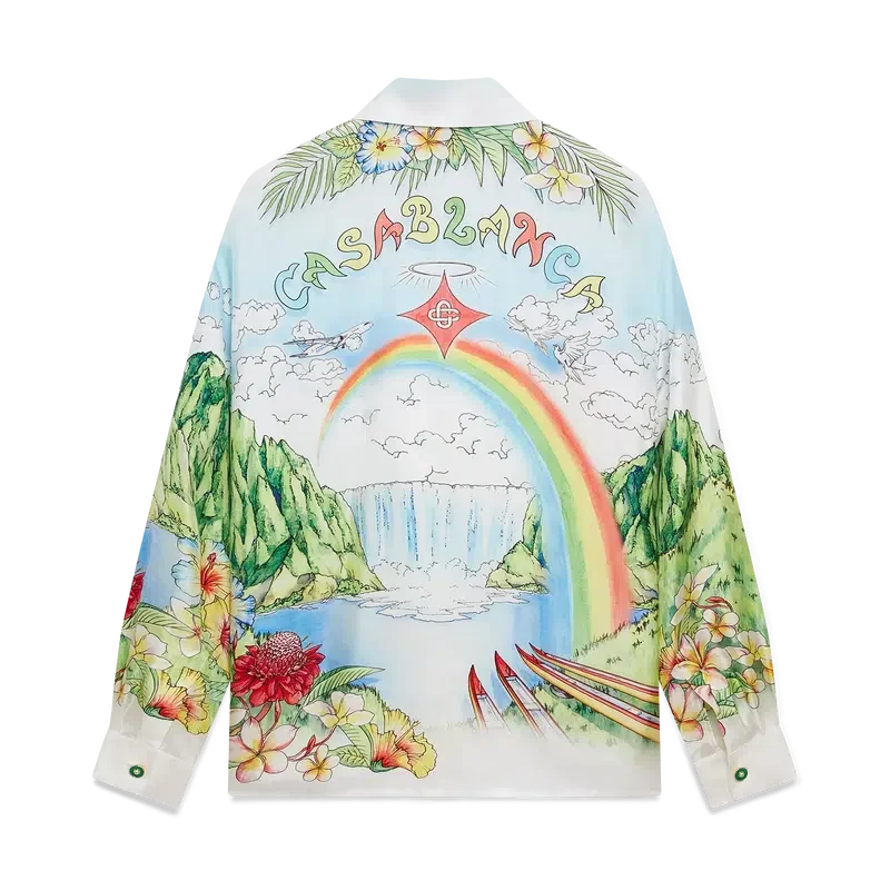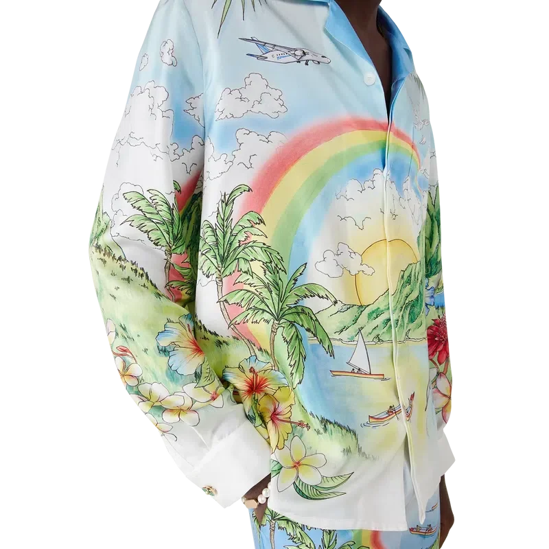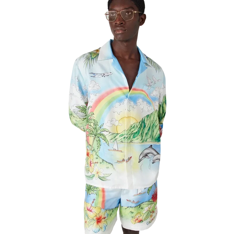 Das Aloha-Langarmhemd präsentiert eine lebendige, gemalte Darstellung von Kauai, Hawaii, und zeigt dessen bergiges Paradies, Wasserfälle, verspielte Delfine, Kanus und einen Regenbogen, wobei die Schönheit der Landschaft besonders hervorgehoben wird. Abgerundet durch eine Silhouette mit Kragen, Knopfleiste, ineinander verschlungenen Cc-Logo-Knöpfen und dem charakteristischen goldgerahmten Perlenknopf an den Manschetten sowie raffinierten Details, die den luxuriösen Sport-Freizeit-Stil der Marke widerspiegeln.