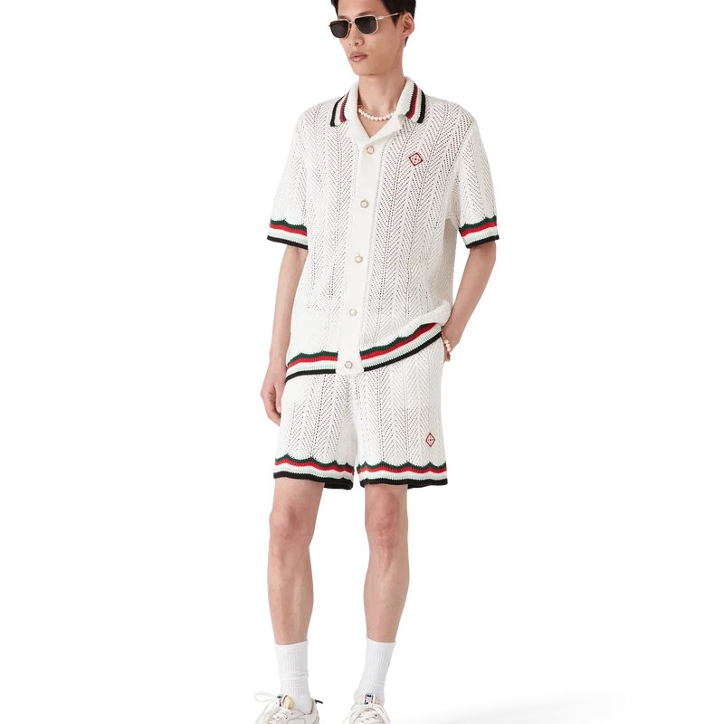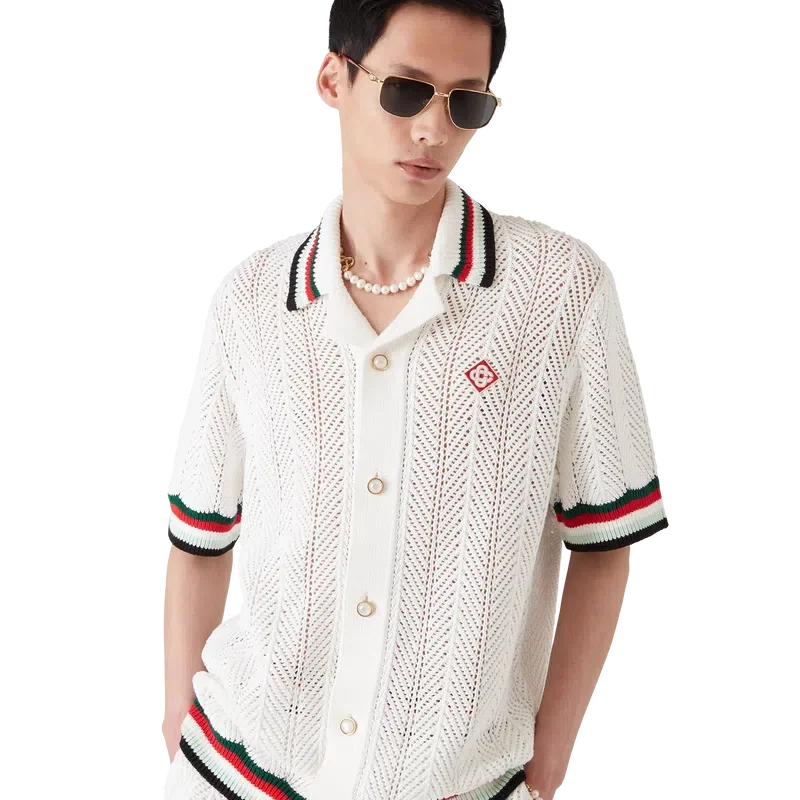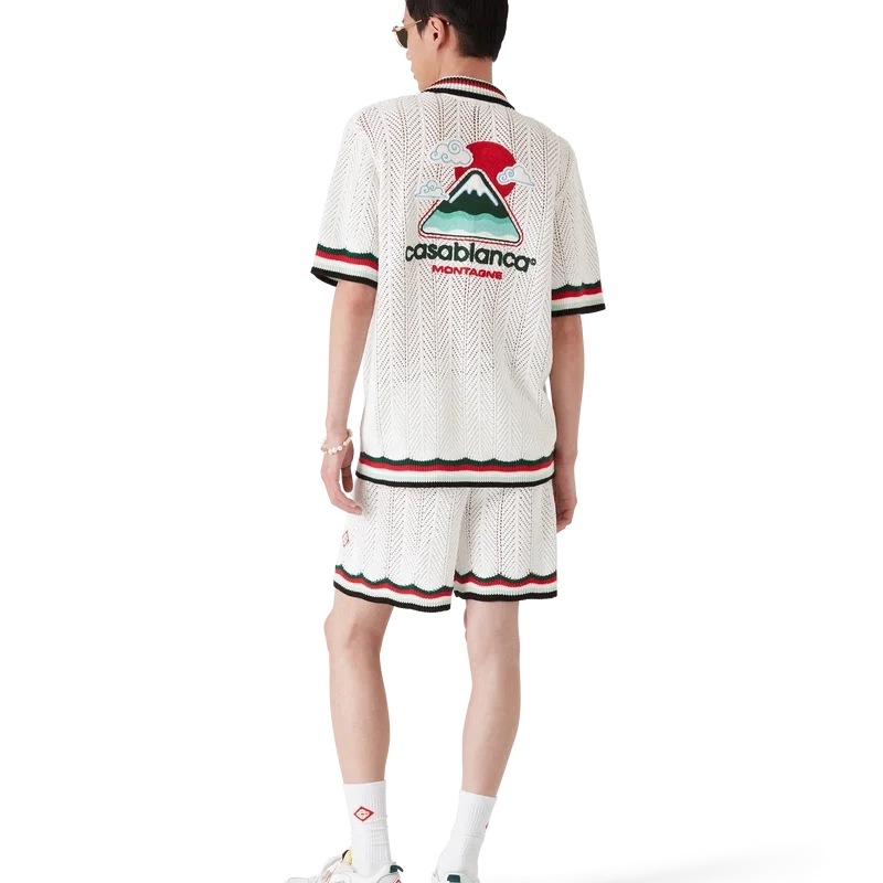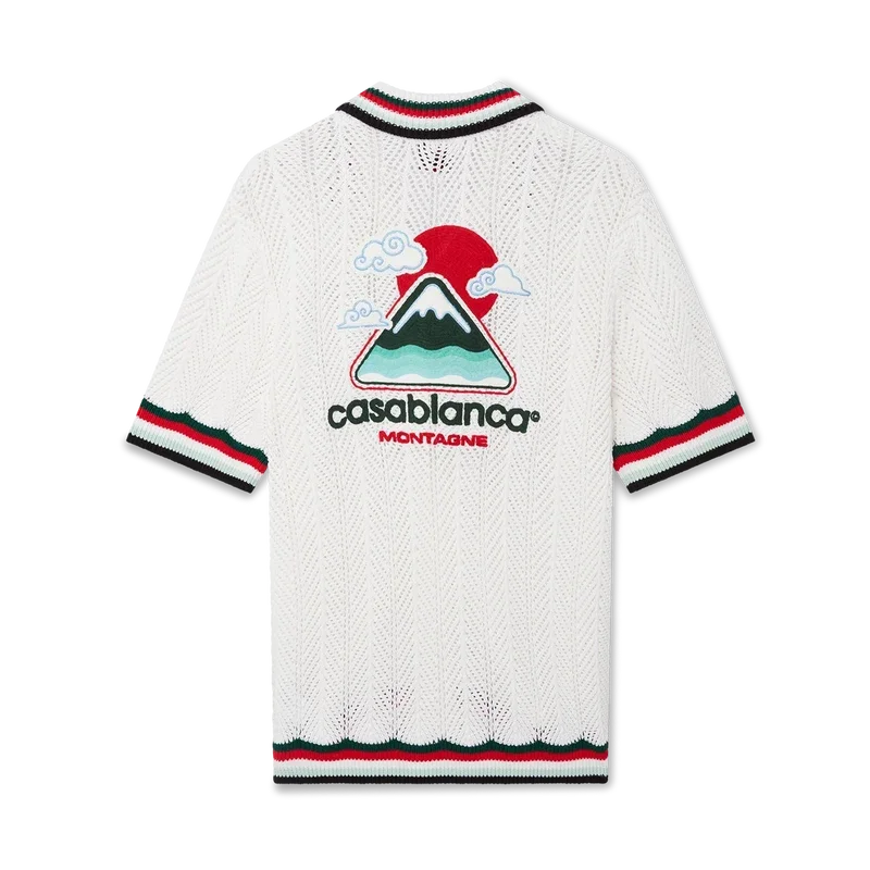 Das Montagne Ondulee Häkelhemd ist ein kurzärmeliges Strickmodell aus gehäkelter Baumwolle und ziert das charakteristische Rautenlogo des Hauses sowie saisonale Kunstmotive – inspiriert von Japans reichhaltiger Ikonografie, vermittelt es mit seinem schlichten Layout und den Kunstmotiven eine starke visuelle Botschaft mit nur wenigen Linien und Farben und ist damit eines der Wahrzeichen der Kollektion.