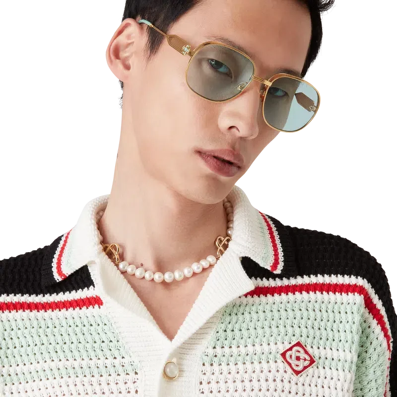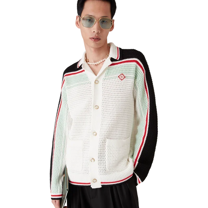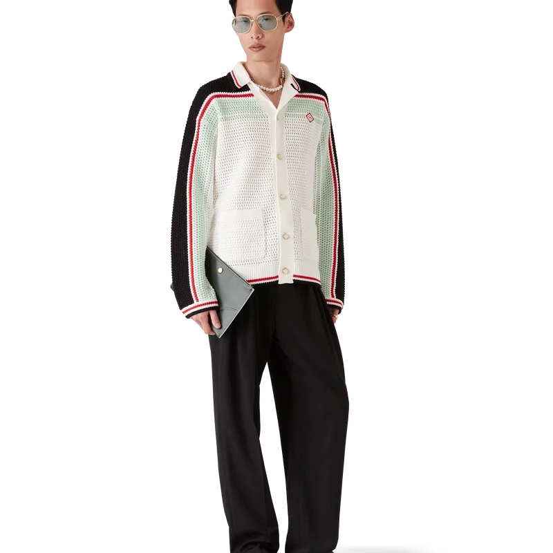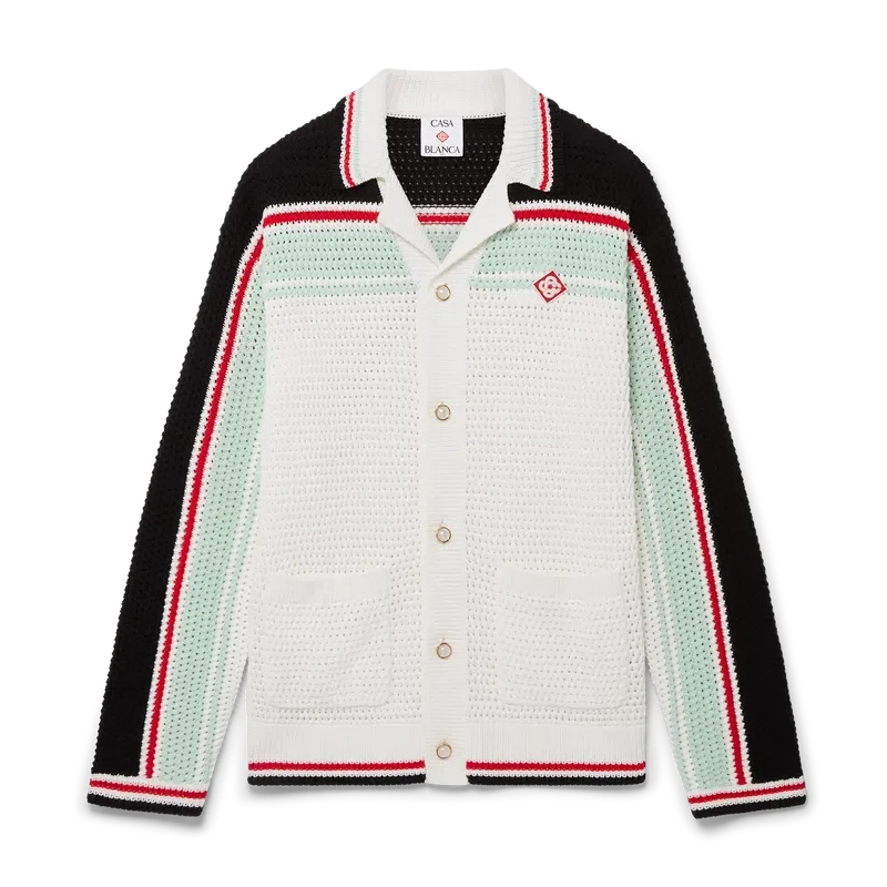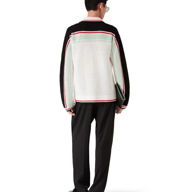 Die Cotton Tennis Crochet Shacket ist ein langärmeliges Modell mit strukturiertem Design aus gehäkelter Baumwolle, das mit dem charakteristischen Rautenlogo des Hauses verziert ist und an das Reise- und Urlaubsthema der Kapselkollektion anknüpft. Abgerundet durch einen gerippten Kragen, Ärmelbündchen, Saum und Knopfleiste, aufgesetzte Taschen vorne, Knopfverschluss, charakteristische goldgeränderte Perlenknöpfe sowie schwarze, rote, mintfarbene und weiße Streifenverzierungen auf Brust, Rücken und entlang der Ärmel sowie gestreifte Kanten an Ärmelbündchen, Saum und Kragen.