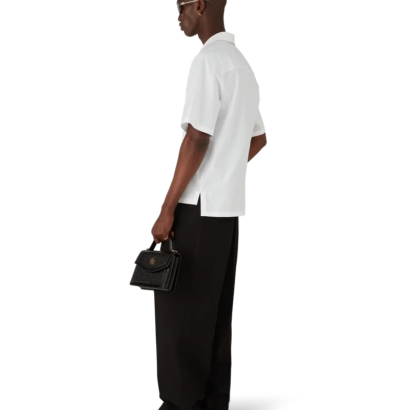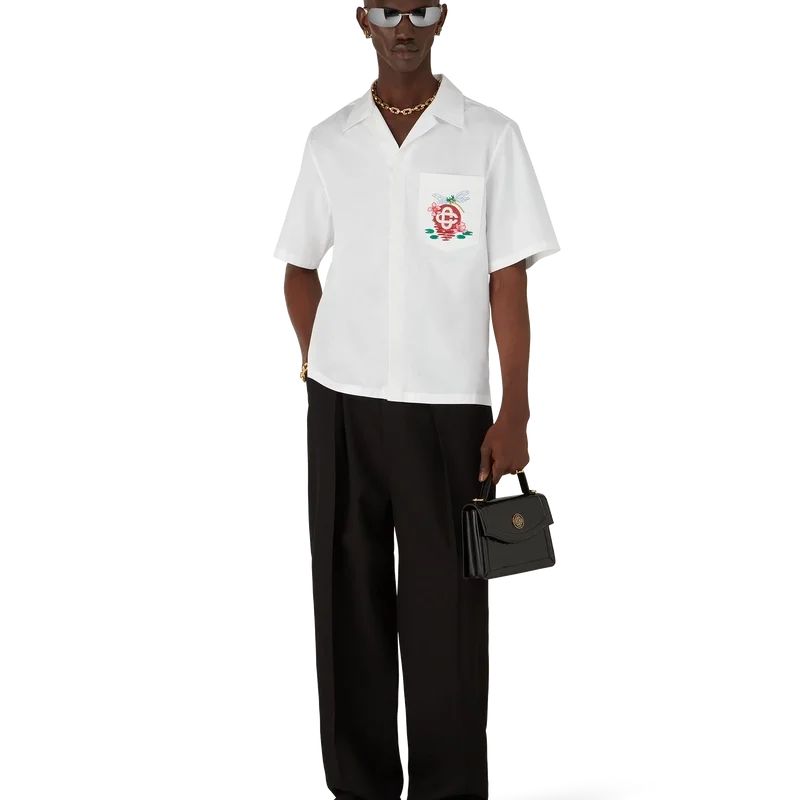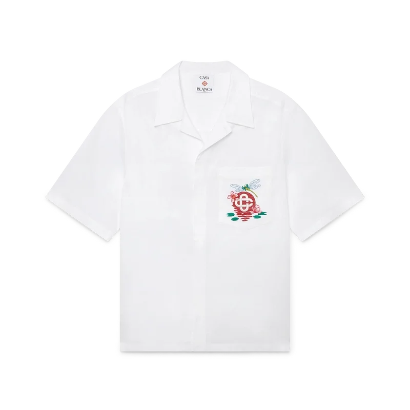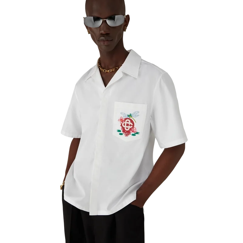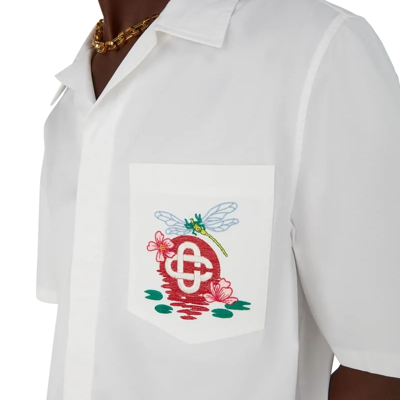 Das bestickte Kurzarm-Shirt aus Baumwollpopeline ist ein klassisches Design aus Baumwollstoff mit saisonalen Motiven, bei denen die Libelle als zentrales Symbol im Vordergrund steht und einen weicheren, sanfteren Kontrast bildet, während die Lotusblumen und die Reflexion der Sonne auf dem Wasser an Casablancas Natursymbolik anknüpfen. Abgerundet wird das Design durch einen Kubanerkragen, einen Knopfverschluss, eine Brusttasche, die charakteristischen Corozo-Knöpfe mit dem ineinander verschlungenen Cc-Logo sowie einen High-Low-Saum.