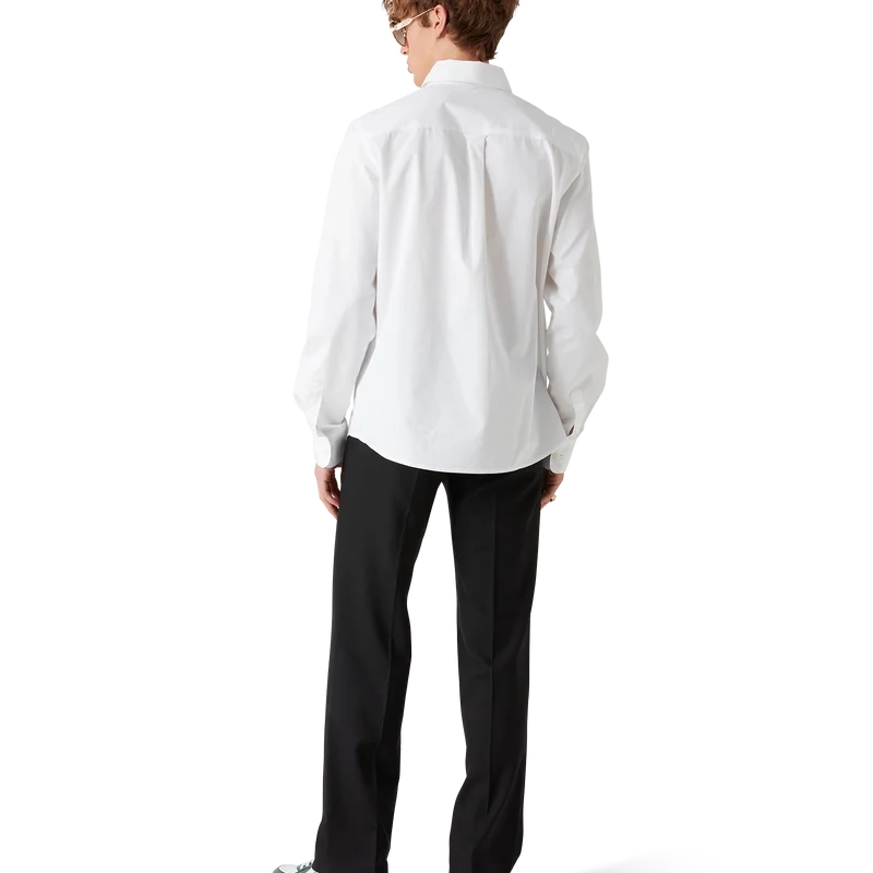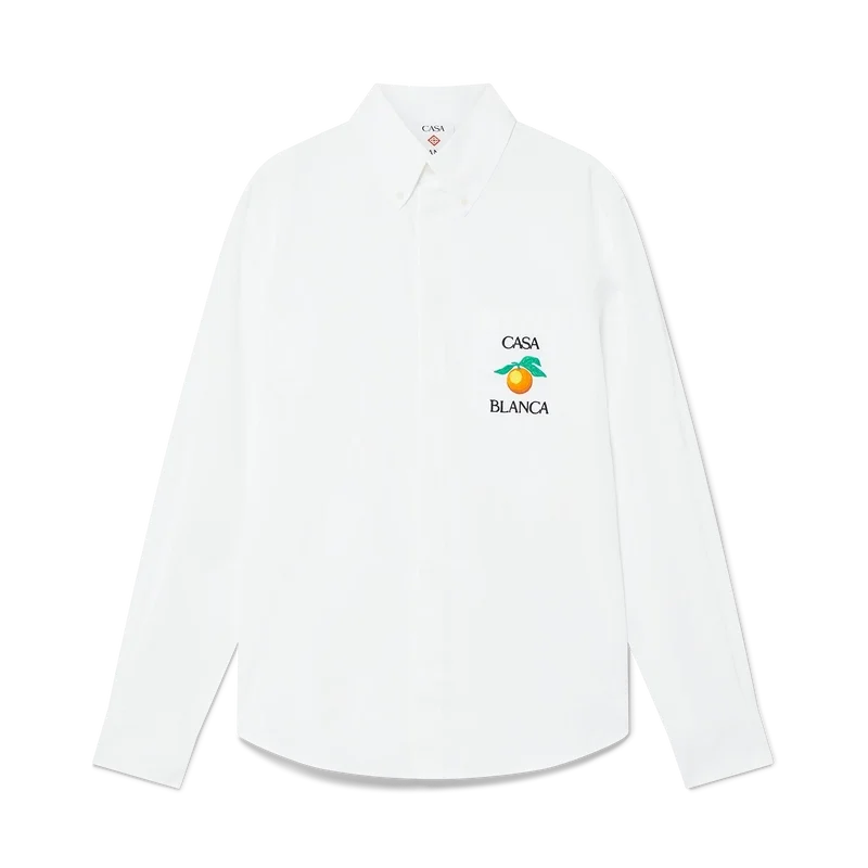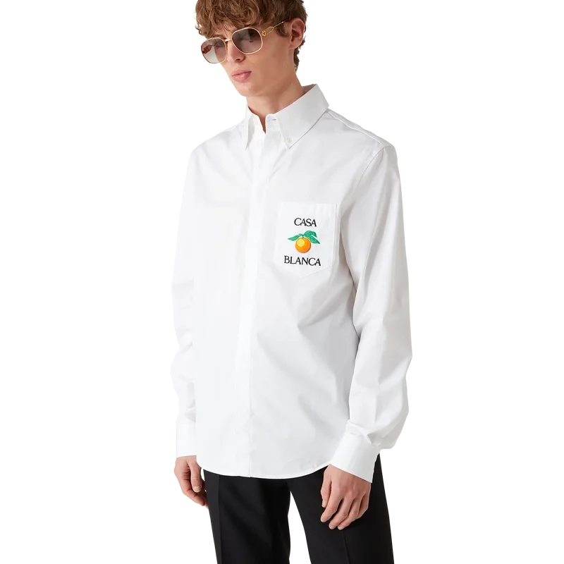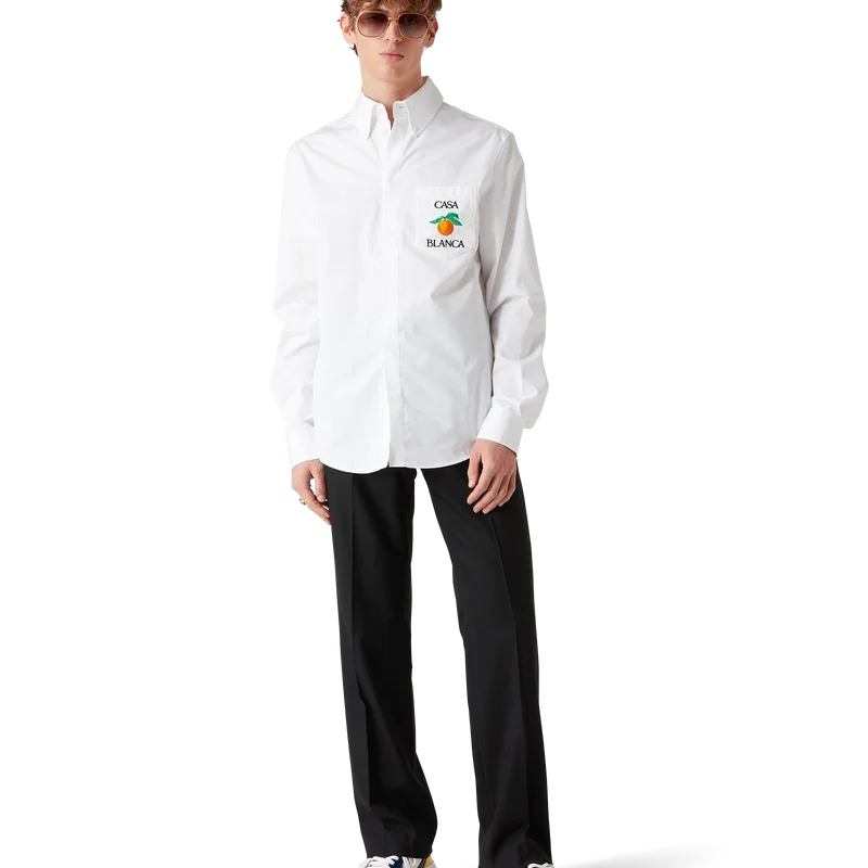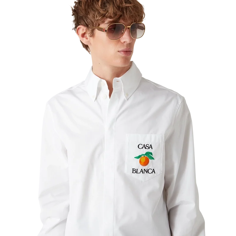 Das bestickte orangefarbene Oxford-Hemd ist ein Langarm-Modell aus Baumwollstoff und verfügt über eine orangefarbene Stickerei – eines der Designelemente des Hauses – sowie den Schriftzug „Casablanca“. Abgerundet wird es durch eine Brusttasche, einen spitzen Button-Down-Kragen, einen verdeckten Knopfverschluss vorne und Corozo-Knöpfe mit dem ineinander verschlungenen Cc-Logo.