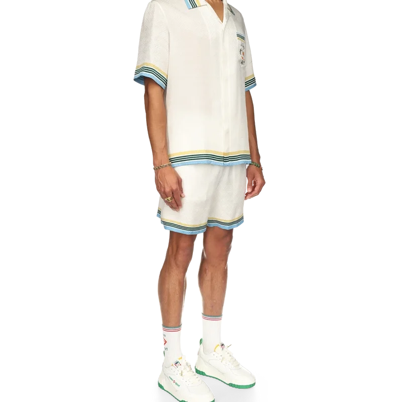 Das Casa Way Seidenhemd zeigt einen Druck des ikonografischen orangefarbenen Pyramiden-Motivs des Hauses mit Tennisschlägern und floralen Details, die für diese Saison neu interpretiert wurden. Mit einem Casablanca-Markenlabel und kontrastierenden Details an Kragen, Manschetten, Saum und Brusttasche – entworfen für eine klassische Passform.