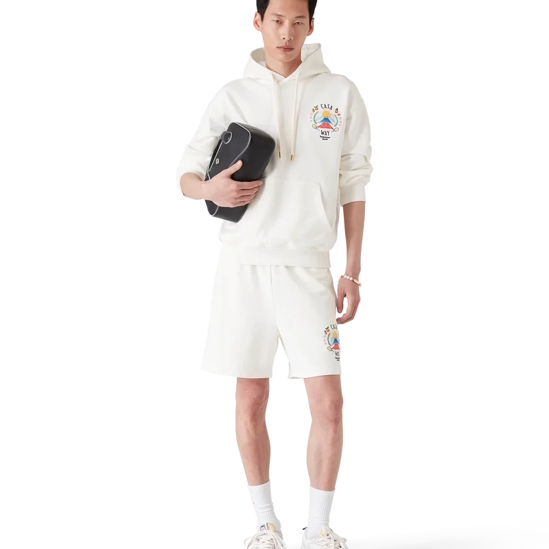 Das Casa Way Mountain Kapuzensweatshirt ist ein langärmeliges Modell aus Bio-Baumwollstoff und zeigt das für diese Saison neu interpretierte saisonale Design des Hauses. Ausgestattet mit einer Kapuze mit Kordelzug, einer Känguru-Tasche vorne sowie gerippten Bündchen und Saum.