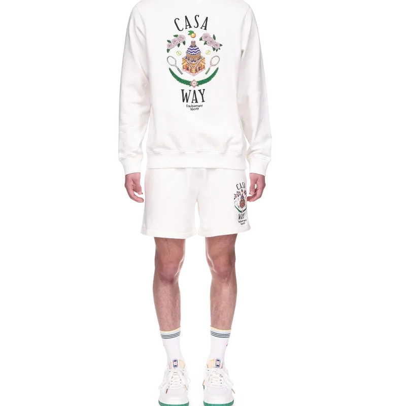 Das Casa Way Off-White Unisex-Sweatshirt verfügt über gestickte Illustrationen von Sportgeräten und floralen Details. Das Modell aus Bio-Baumwolle ist ein klassisches Langarm-Sweatshirt mit Rundhalsausschnitt und wurde für eine lockere Passform entworfen.
