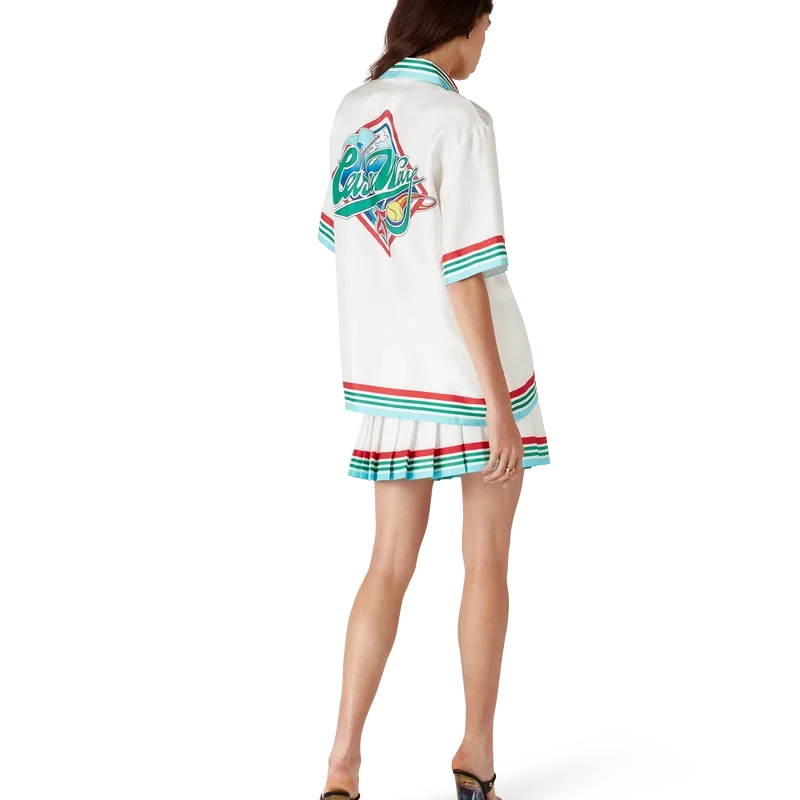 Das Casa Way World Series Seidenhemd ist ein bedrucktes Kurzarm-Modell mit dem Artwork der Saison, das klassische amerikanische Baseball-Symbole für Casa Way Tennis neu interpretiert und aus Seidentwill gefertigt ist.