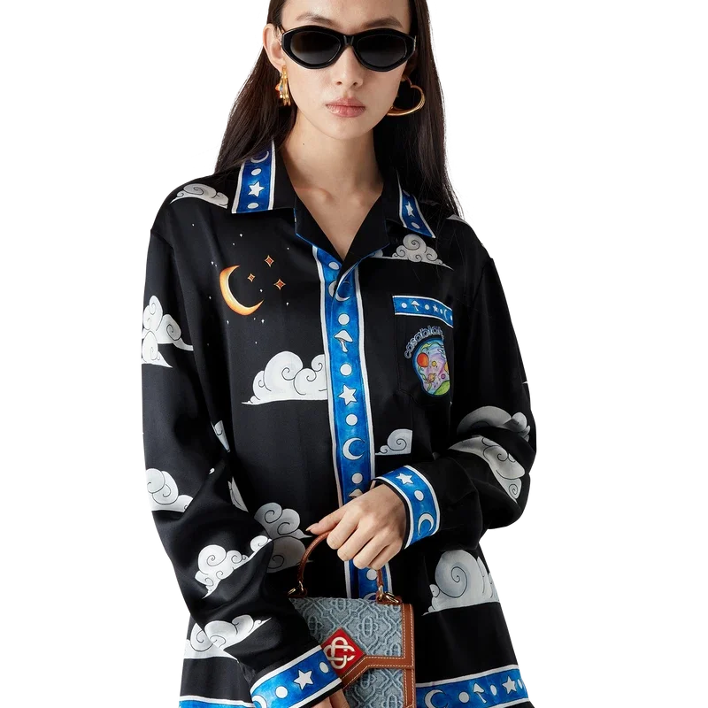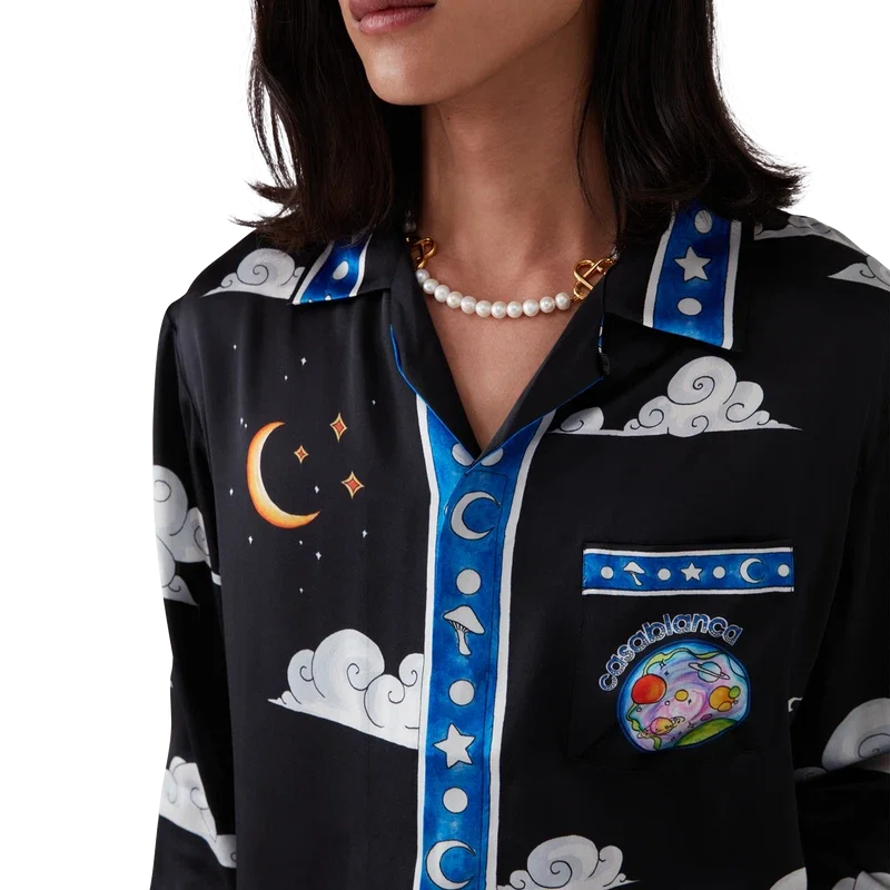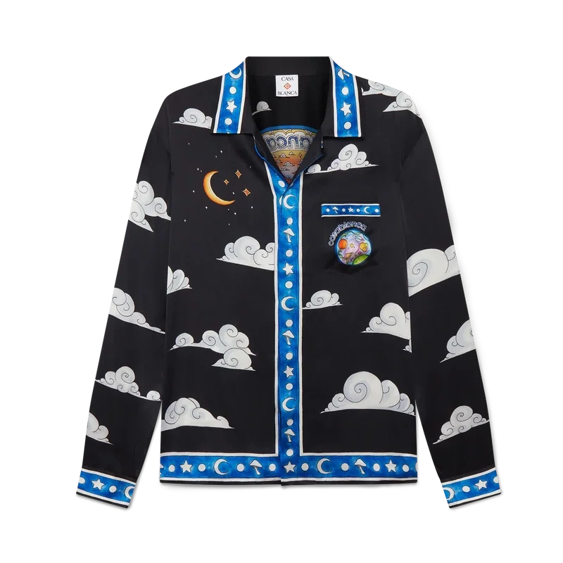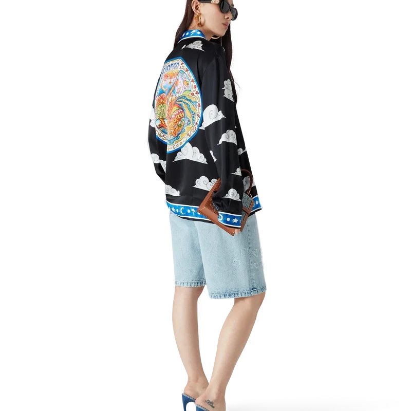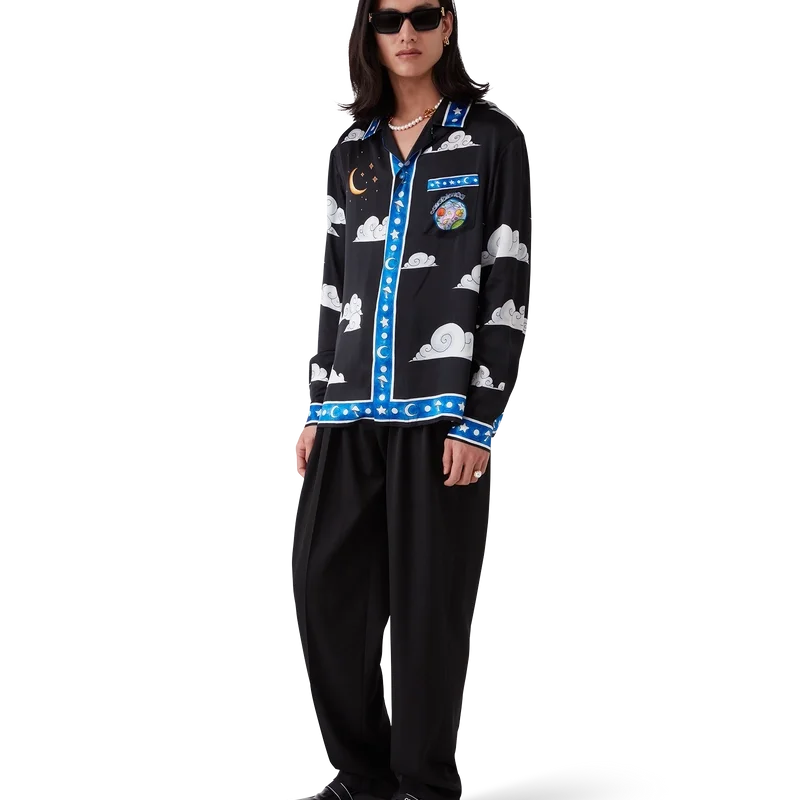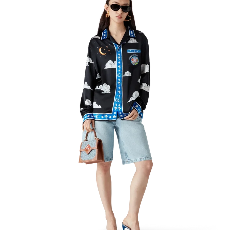 Das „The Four Elements“-Seidenhemd ist ein langärmeliges, durchgehend bedrucktes Modell aus Seidensatin mit einem Design, das alle Elemente von La vereint: Skyline, Strand, Feuer, Vegetation und Astronomie. Ausgestattet mit einem Kubanerkragen, einer Brusttasche, einem verdeckten Knopfverschluss mit ineinander verschlungenen Cc-Logo-Knöpfen aus Corozo, einem goldrandigen Emailleknopf an jedem Manschettenbund sowie Kantenverzierungen an Kragen, Manschetten, Knopfleiste, Saum und Tasche.<!–