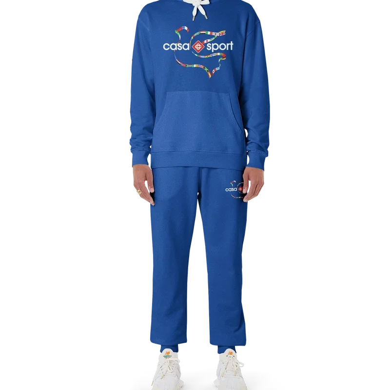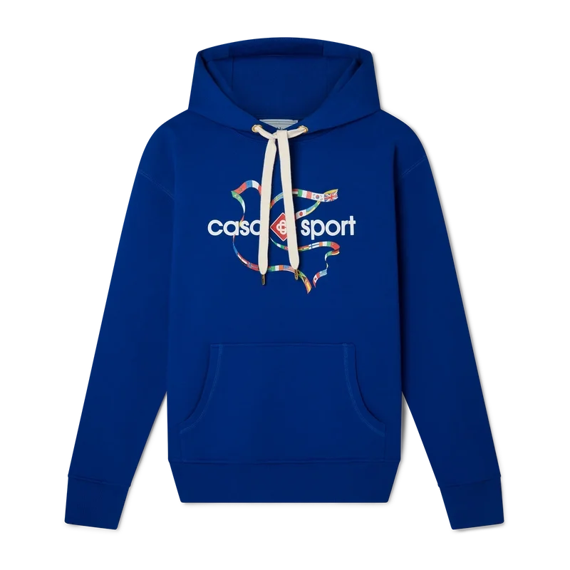 Das Drapeau De Collombes Kapuzensweatshirt aus Bio-Baumwolle mit Siebdruck zeigt saisonale Motive, die die charakteristische Casa Sport-Ikonografie des Hauses einbeziehen. Mit klassischem Rundhalsausschnitt, langen Ärmeln und einem Casablanca Paris-Markenlabel, entworfen für eine lockere Passform.