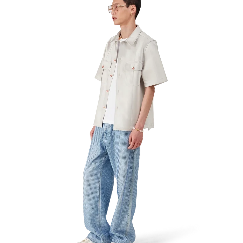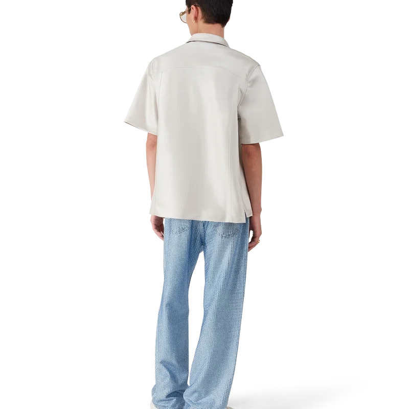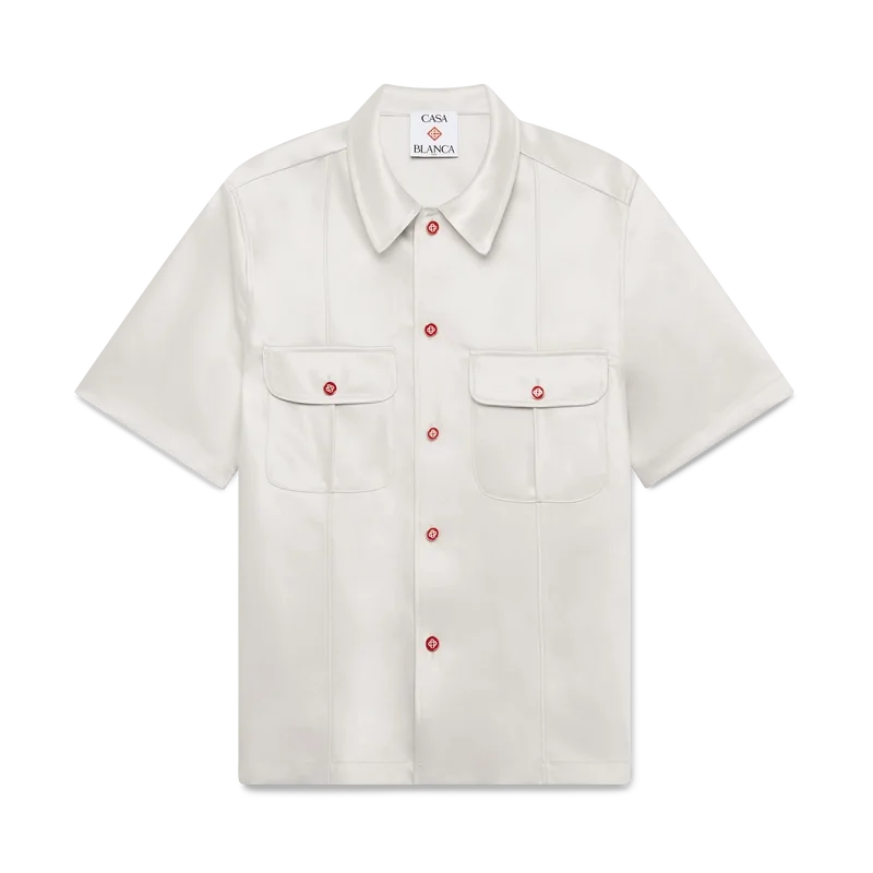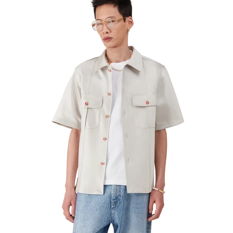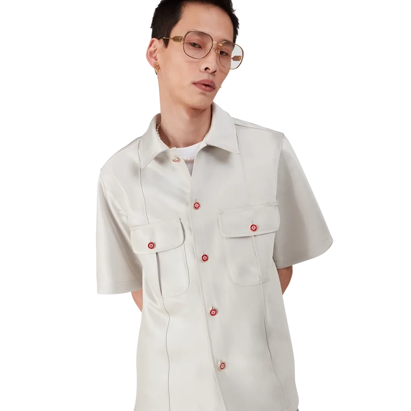 Das Duchesse-Satin-Hemd ist ein kurzärmeliges Modell aus Duchesse-Satin. Es verfügt über einen Knopfverschluss, rote Cc-Flachknöpfe aus Emaille, einen spitzen Kragen, Biesen an Vorder- und Rückseite, 2 cm lange Seitenschlitze sowie aufgesetzte Brusttaschen mit Patte und Knopfverschluss.