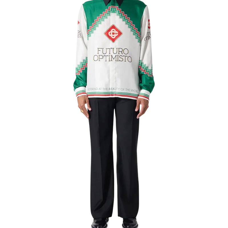 Das Futuro Optimisto Seidenhemd ist ein Key Piece aus der Frühjahr/Sommer-Kollektion 2023 mit dem Schriftzug „Looking at the Beauty of the World“ und dem charakteristischen Diamond Monogram des Hauses. Inspiriert von der ewigen Hoffnung des Geistes steht Futuro Optimisto für den Menschen im Einklang mit der Schöpfung. Veredelt mit unserem charakteristischen Kragen- und Manschettenverschluss mit goldgerahmten Perlknöpfen, verdeckter Knopfleiste und einem „Casablanca Paris“-Markenlabel.