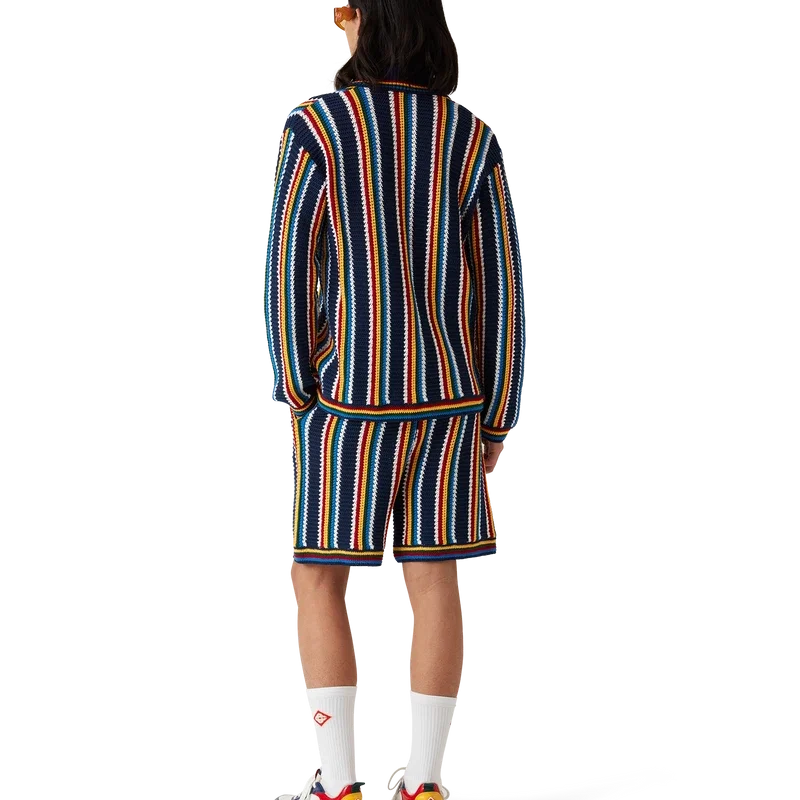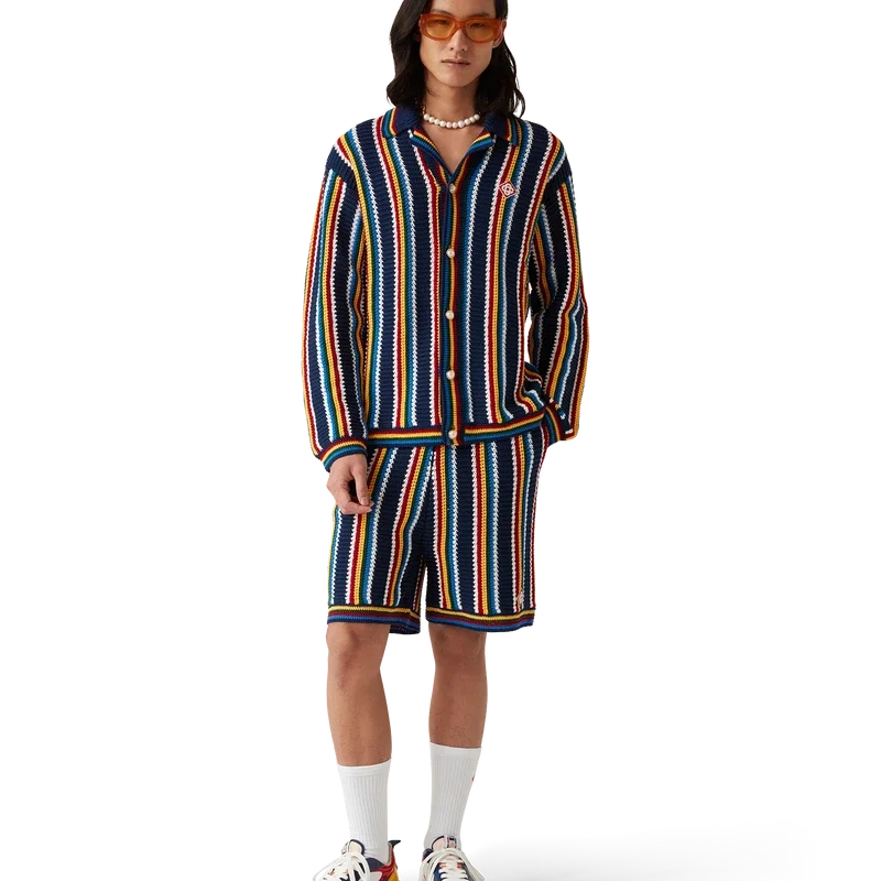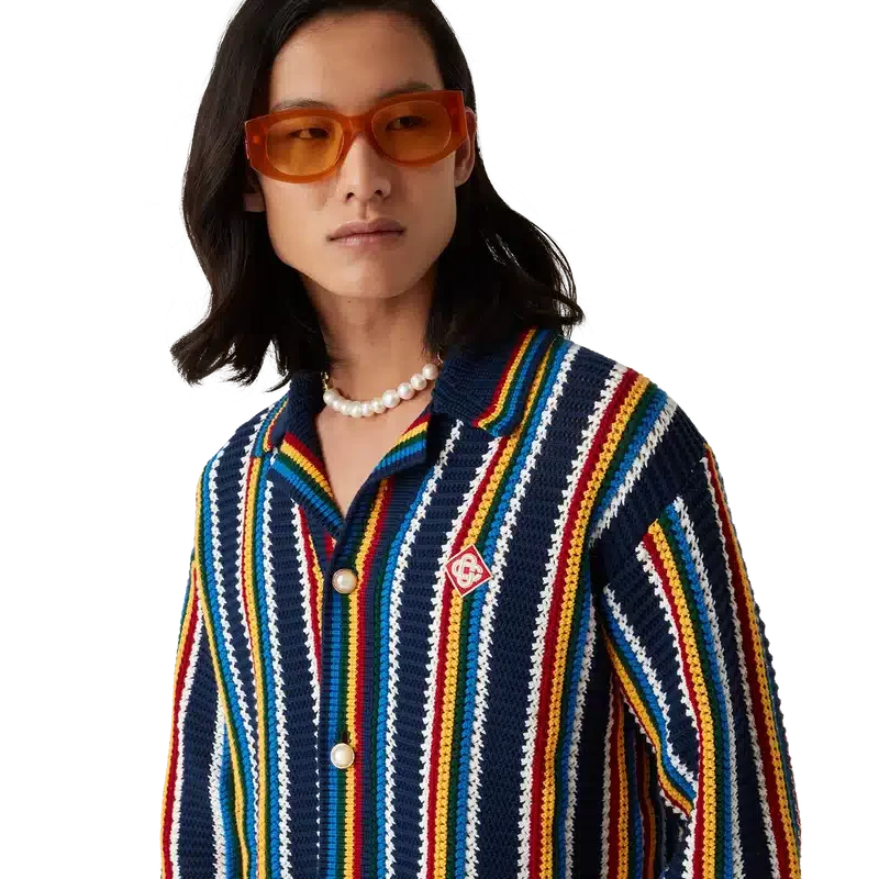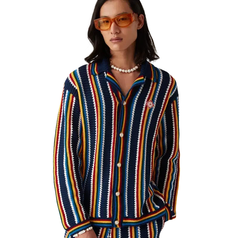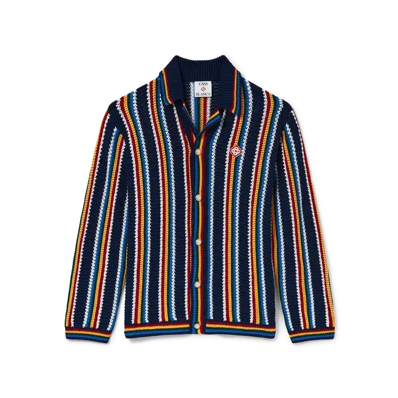 Das gestreifte Häkelhemd ist ein gestreiftes, langärmeliges Modell mit Struktur, das aus einem Baumwoll-Häkelstoff gefertigt ist und das charakteristische Rautenlogo des Hauses ziert. Abgerundet wird es durch einen gerippten Kragen, Ärmelbündchen, Saum und Knopfleiste, charakteristische goldgerahmte Perlmuttknöpfe sowie einen Knopfverschluss vorne.