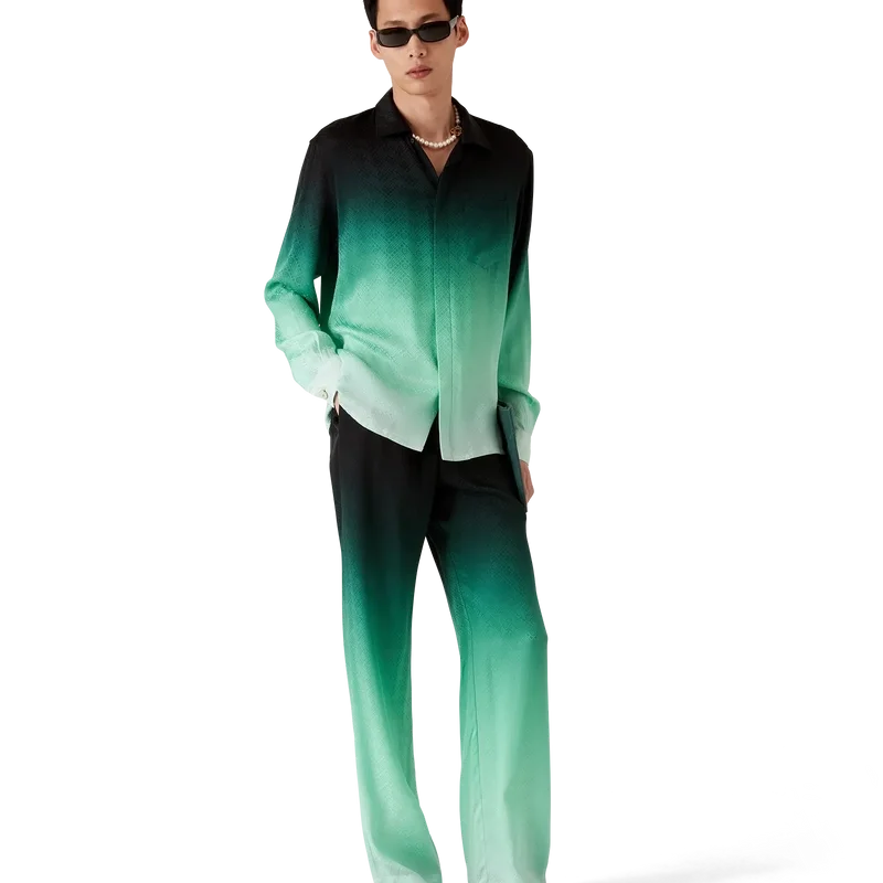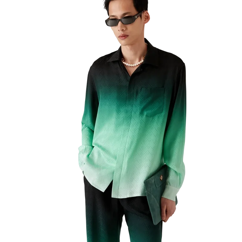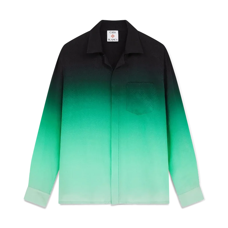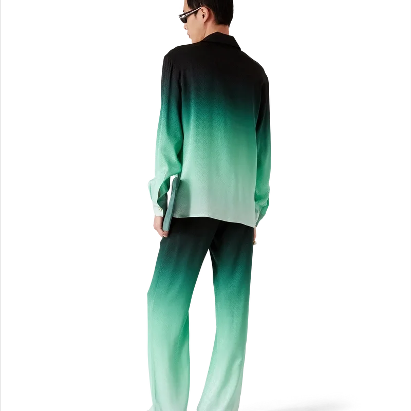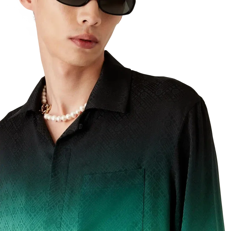 Das langärmelige Seidenhemd „Gradient Ping Pong“ ist ein durchgehend bedrucktes Design – ein klassisches Monogramm, das für unsere erste japanische Kollektion entwickelt wurde und sich durch ein sich wiederholendes Motiv aus diagonal fliegenden Tischtennisbällen auszeichnet – gefertigt aus einem Monogramm-Seidentwill. Abgerundet durch einen Kubanerkragen, einen Knopfverschluss, Corozo-Knöpfe mit ineinander verschlungenem CC-Logo und die charakteristischen emaillierten Knöpfe mit Goldrand an den Manschetten.