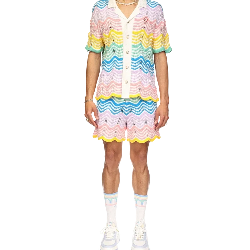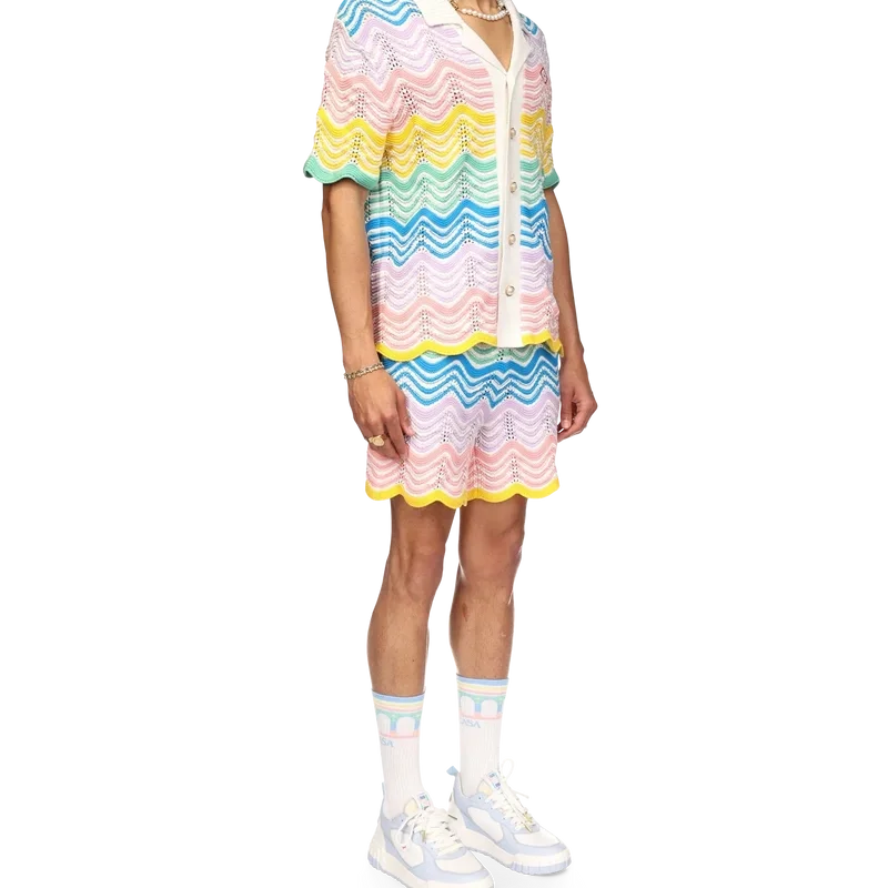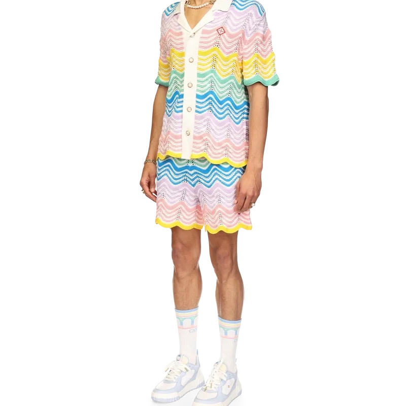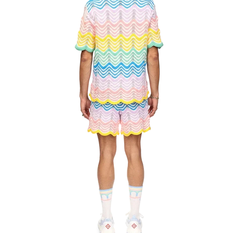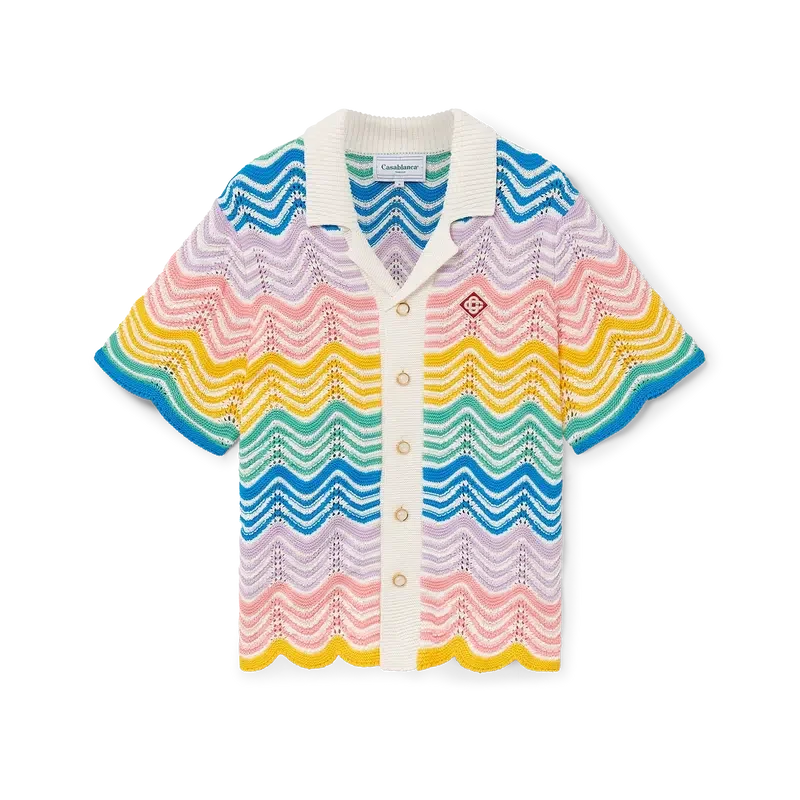 Das Gradient Wave Knit Hemd ist ein klassisches Design von Casablanca, gefertigt aus einem gehäkelten Baumwollstoff mit dem für das Haus typischen Wellenmuster, das vom Memphis-Stil inspiriert ist und als grundlegendes Designelement dient. Die Farbpalette dieser Kollektion ist hell und idealistisch und unterstreicht die für unsere Marke zentralen ätherischen Themen. Abgerundet wird das Design durch das charakteristische Diamant-Logo des Hauses, kurze Ärmel sowie einen kontrastierenden weißen Kragen, Manschetten und eine Knopfleiste mit blauen Kanten.