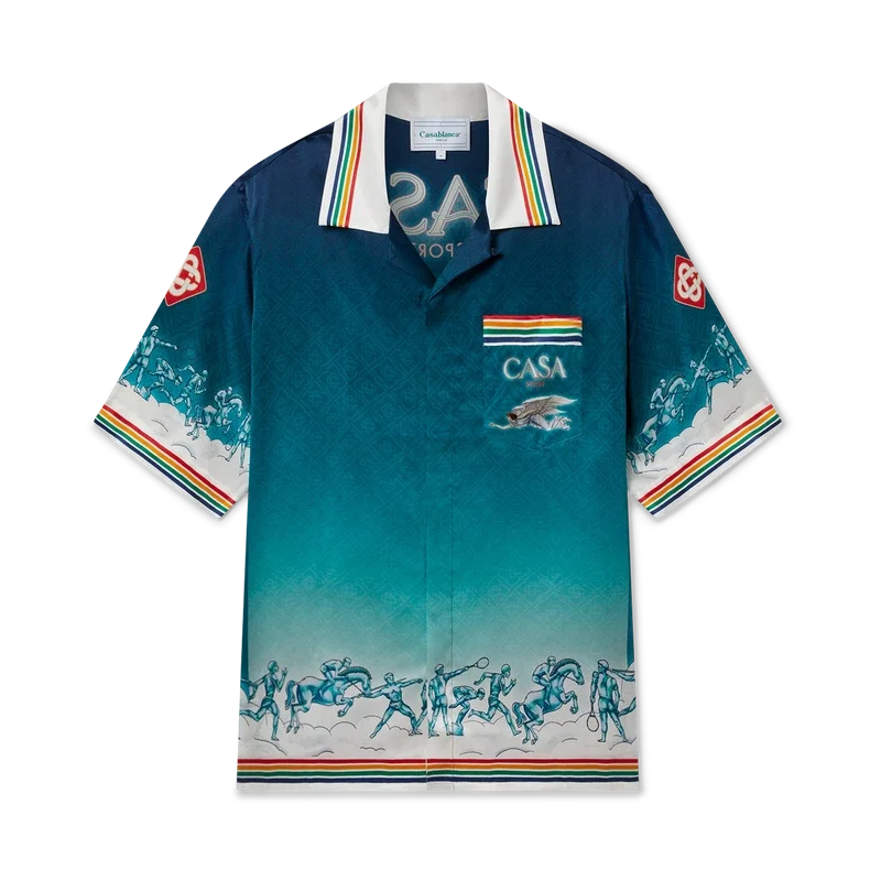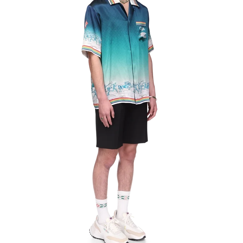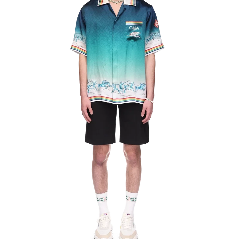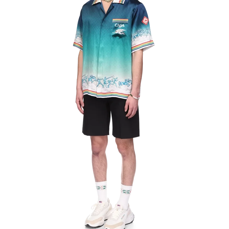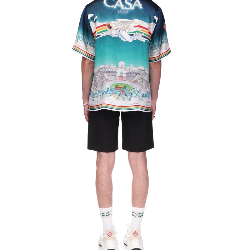 Das La Deesse Du Stade Seidenhemd ist ein bedrucktes Kurzarmmodell aus einem Seidensatin mit Monogramm-Farbverlauf, das mit dem saisonalen Kunstwerk des Hauses verziert ist. Abgerundet wird es durch einen Kubanerkragen, eine Brusttasche, einen Knopfverschluss, ineinander verschlungene Cc-Corozo-Knöpfe sowie mehrfarbige Streifendetails an Kragen, Manschetten, Saum und Brusttasche.