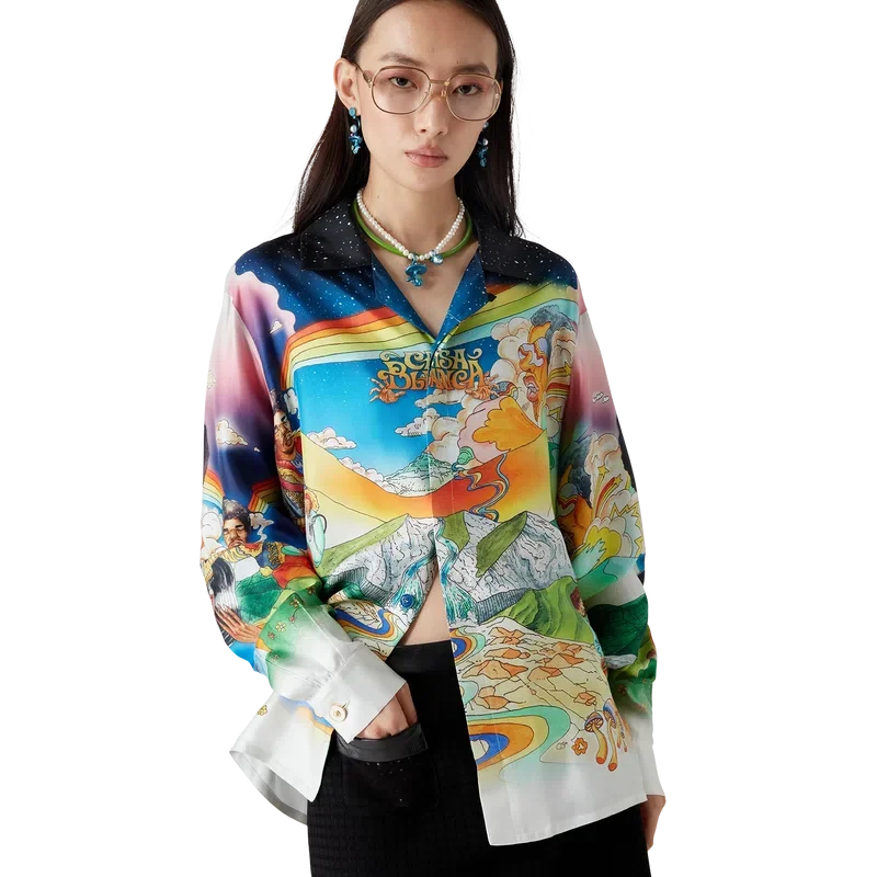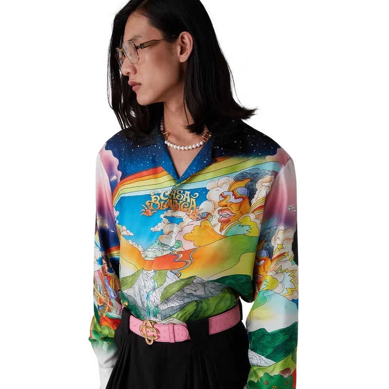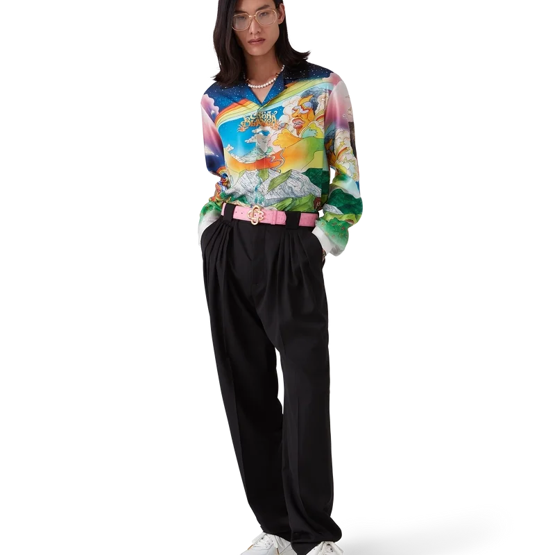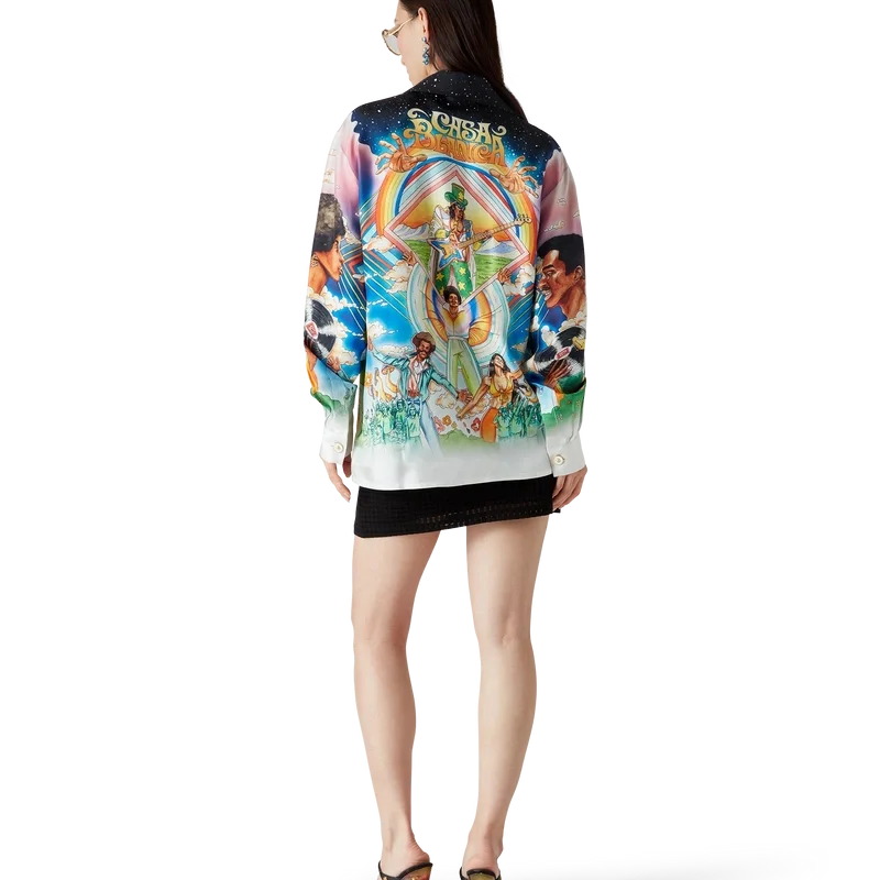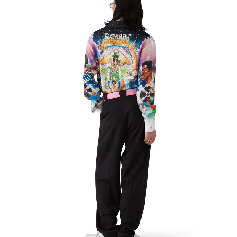Das Seidenhemd „La Musique“ ist ein Langarmmodell aus bedrucktem Seidentwill mit dem saisonalen Motiv, das eine Hommage an Bootsy Collins und ikonische Funk-Platten der 70er Jahre darstellt. Abgerundet wird es durch einen Kubanerkragen, eine Brusttasche, einen verdeckten Knopfverschluss mit ineinandergreifenden Cc-Corozo-Knöpfen und einen goldrandigen Emailleknopf an jedem Ärmelbund.