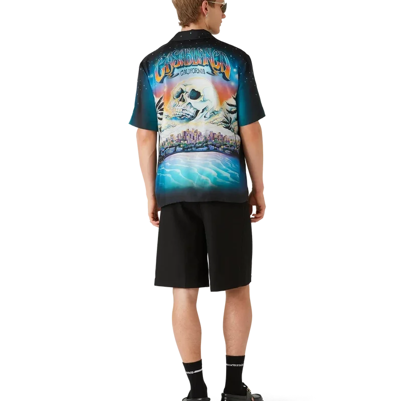 Das La Pramonition Kurzarm-Seidenhemd besticht durch ein raffiniertes Druckdesign mit Motiven, die von einer unheimlichen Vision der Skyline von La bei Nacht inspiriert sind, ergänzt durch UFO-Elemente, die an Vintage-Science-Fiction-Inspirationen anknüpfen. Abgerundet wird das Design durch einen Kubanerkragen, eine Brusttasche sowie einen verdeckten Knopfverschluss mit ineinandergreifenden CC-Corozo-Knöpfen.