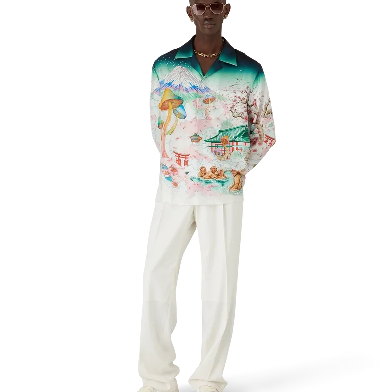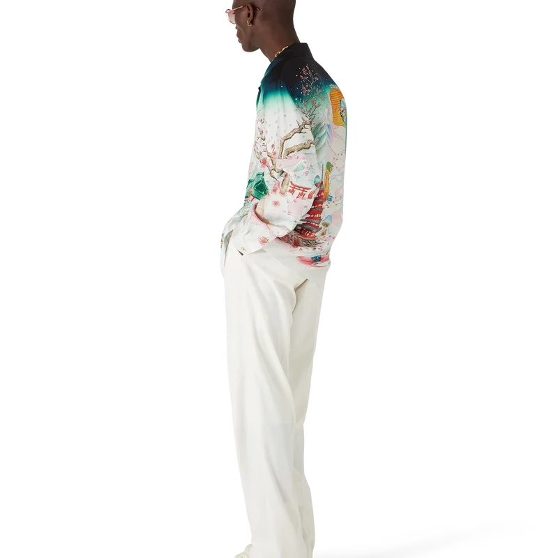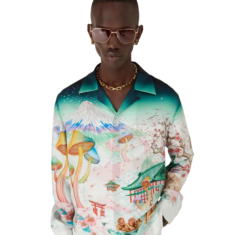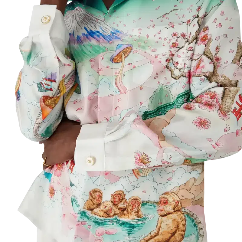 Das langärmelige Seidenhemd „Flowers“ ist ein Allover-Print-Design mit dem Blumen-Motiv der Saison – dieses Hemd erzählt die Geschichte einer Reise durch die Wälder Japans, auf der die Schönheit der Natur erkundet wird, symbolisiert durch Kirschblüten, Pilze und Berge. Das Layout ähnelt unserem griechischen „Eleusis in the Clouds“-Hemd und greift dasselbe Thema der Suche nach Wissen auf. Abgerundet wird es durch einen Kubanerkragen, einen Knopfverschluss, Corozo-Knöpfe mit dem ineinander verschlungenen Cc-Logo sowie goldrandige Emaille-Knöpfe an den Manschetten und eine Brusttasche.