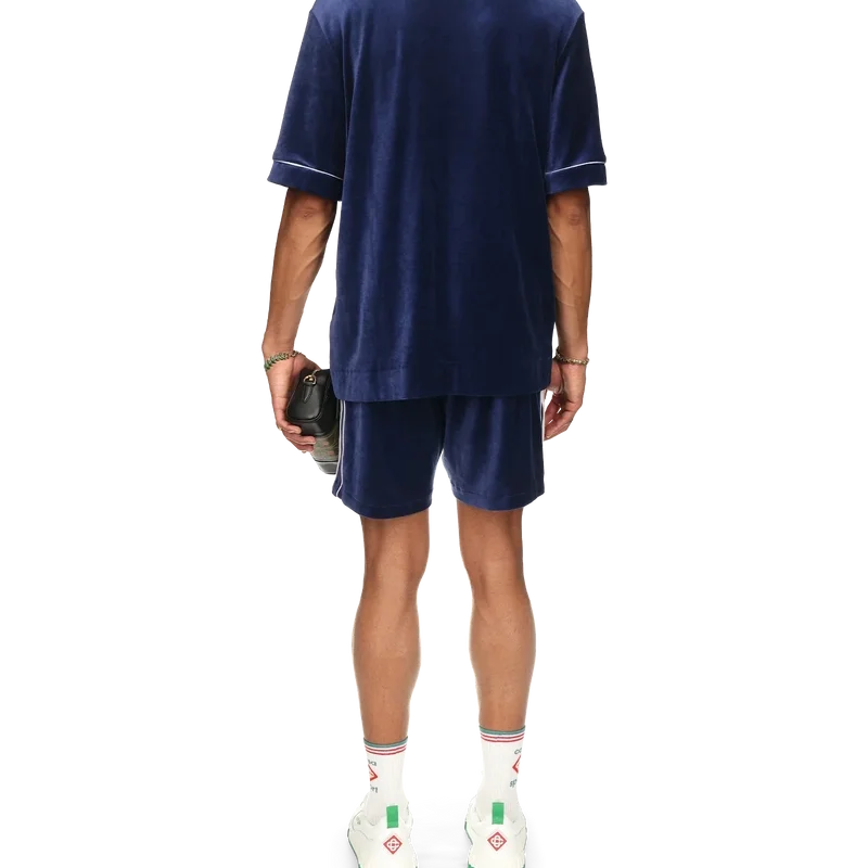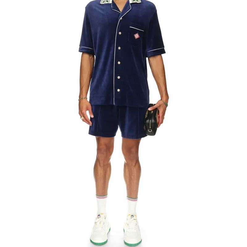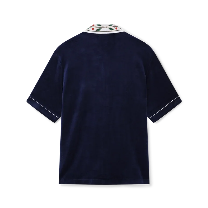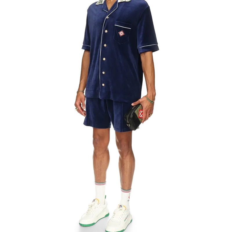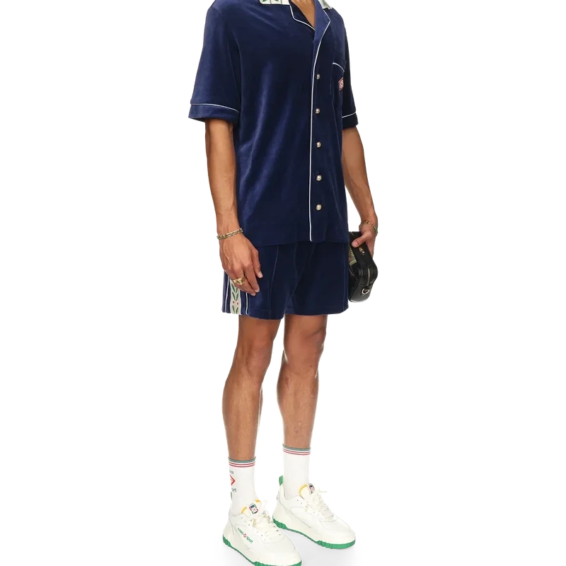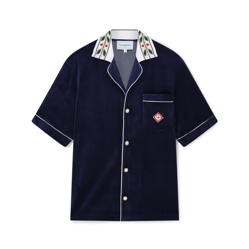 Das Laurel-Velourshemd ist ein kurzärmeliges Modell mit dem Casablanca-Logo auf der Brusttasche. Abgerundet wird es durch eine Brusttasche, einen Knopfverschluss vorne, charakteristische goldgerahmte Perlmuttknöpfe, weiße Paspelierungen an der Knopfleiste, den Manschetten und der Tasche sowie einen Strickkragen mit dem charakteristischen Laurel-Motiv des Hauses.