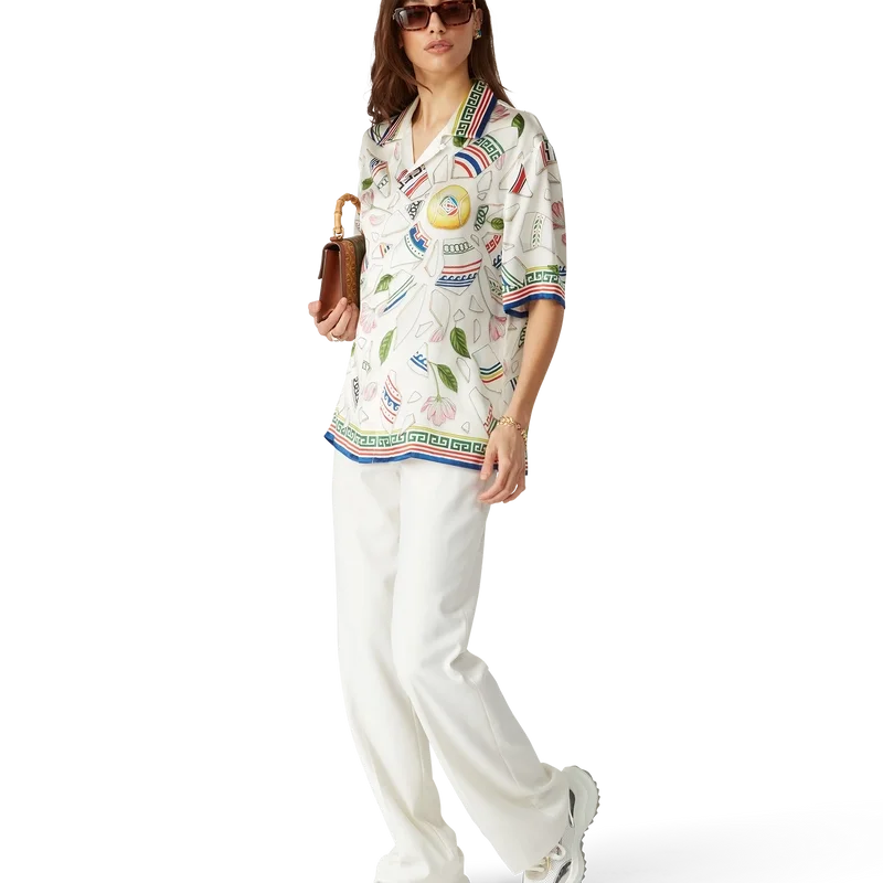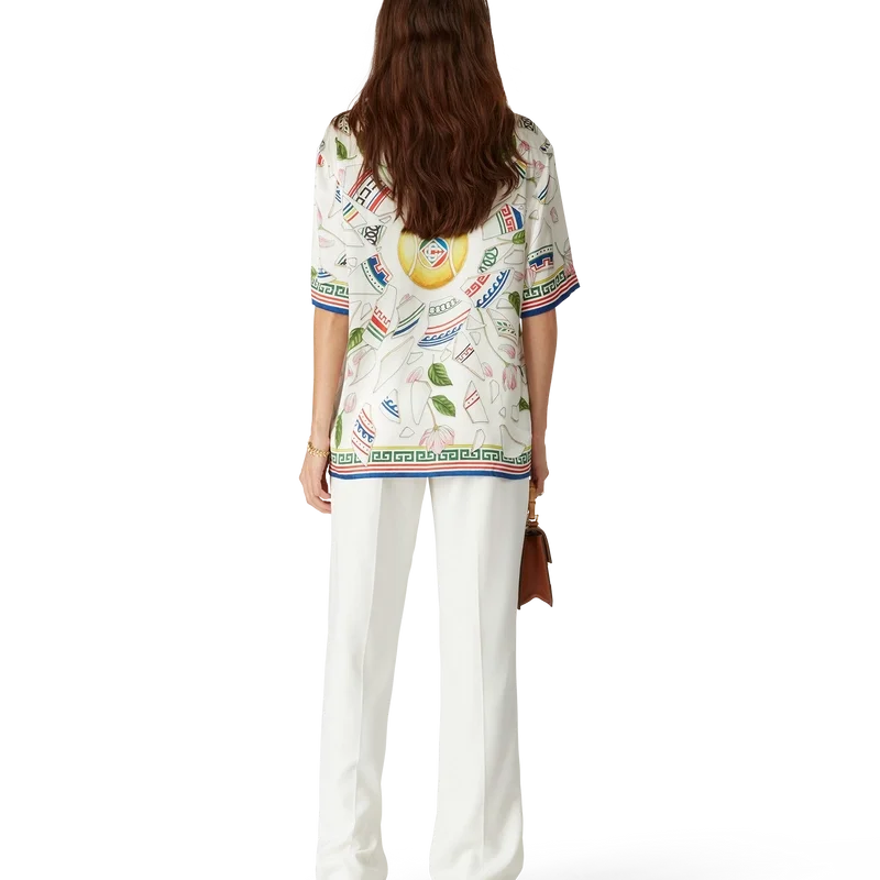 Das Seidenhemd „Le Vase Brise“ ist ein kurzärmeliges Modell mit durchgehendem Druck, gefertigt aus Seidensatin und verziert mit dem saisonalen Kunstwerk des Hauses, das sich wiederholende Fragmente einer zerbrochenen Vase zeigt. Abgerundet durch charakteristische Corozo-Knöpfe mit dem ineinander verschlungenen CC-Logo, Knopfleiste, einen kubanischen Kragen und Details im griechischen Schlüssel-Stil an Manschetten, Kragen und Saum.