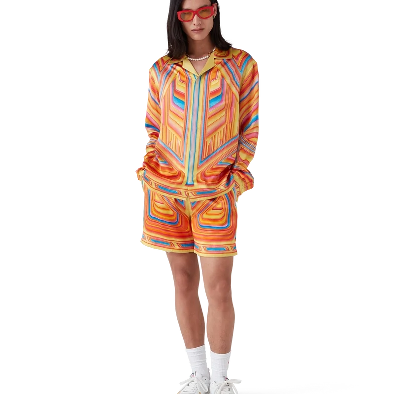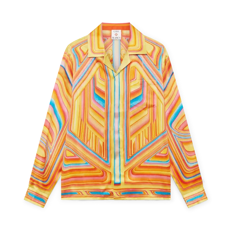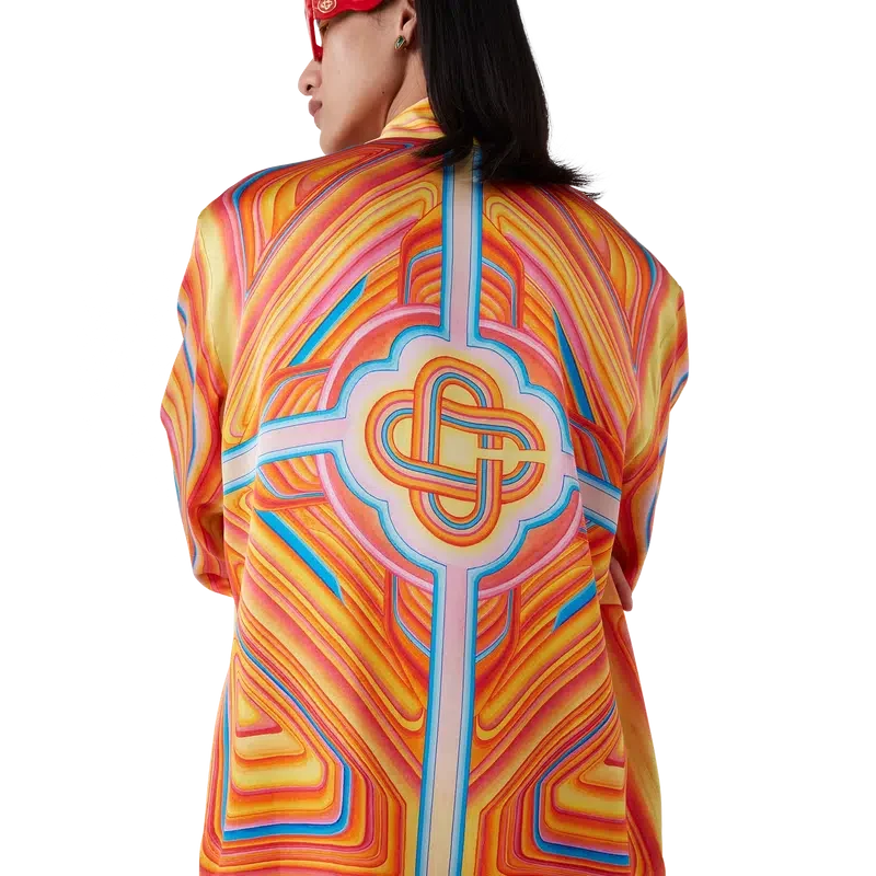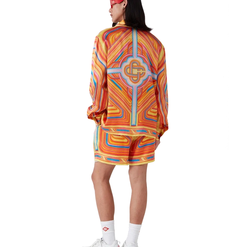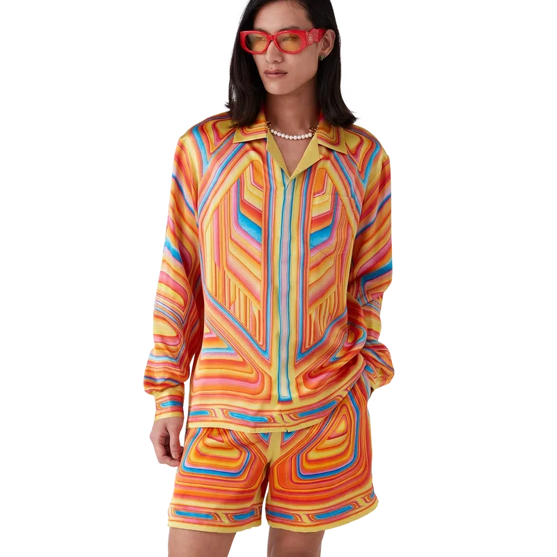 Das Low Rider Seidenhemd ist ein durchgehend bedrucktes Modell aus Seidensatin, dessen Design Anspielungen auf die knalligen Farben und Airbrush-Maltechniken von Low-Rider-Autos sowie das Casablanca-Logo enthält. Es verfügt über einen kubanischen Kragen, eine Brusttasche, einen verdeckten Knopfverschluss mit ineinander verschlungenen Cc-Corozo-Knöpfen sowie einen goldumrandeten Emaille-Knopf an jedem Ärmelbund.