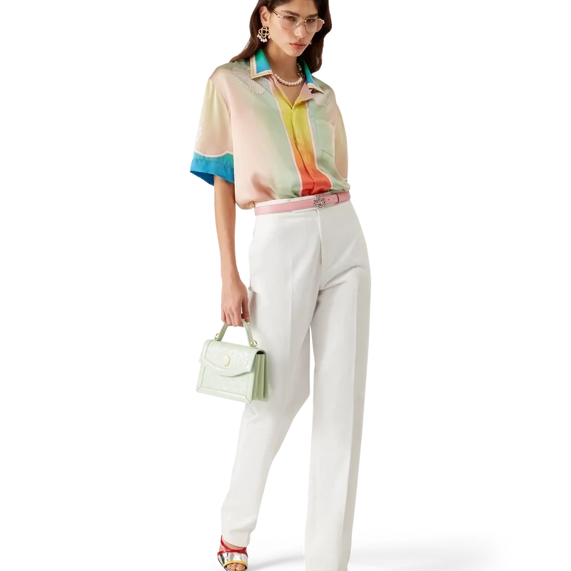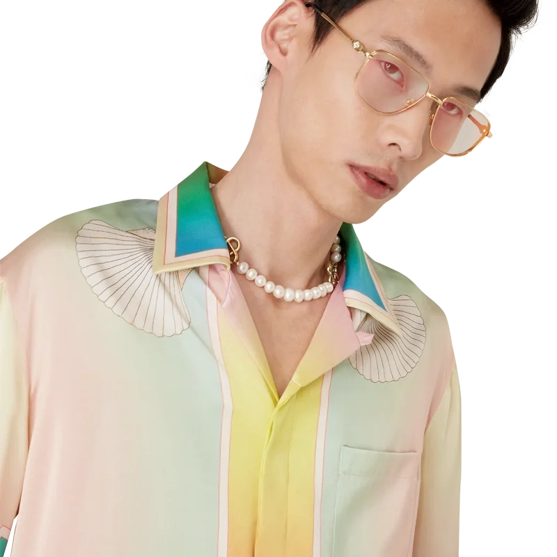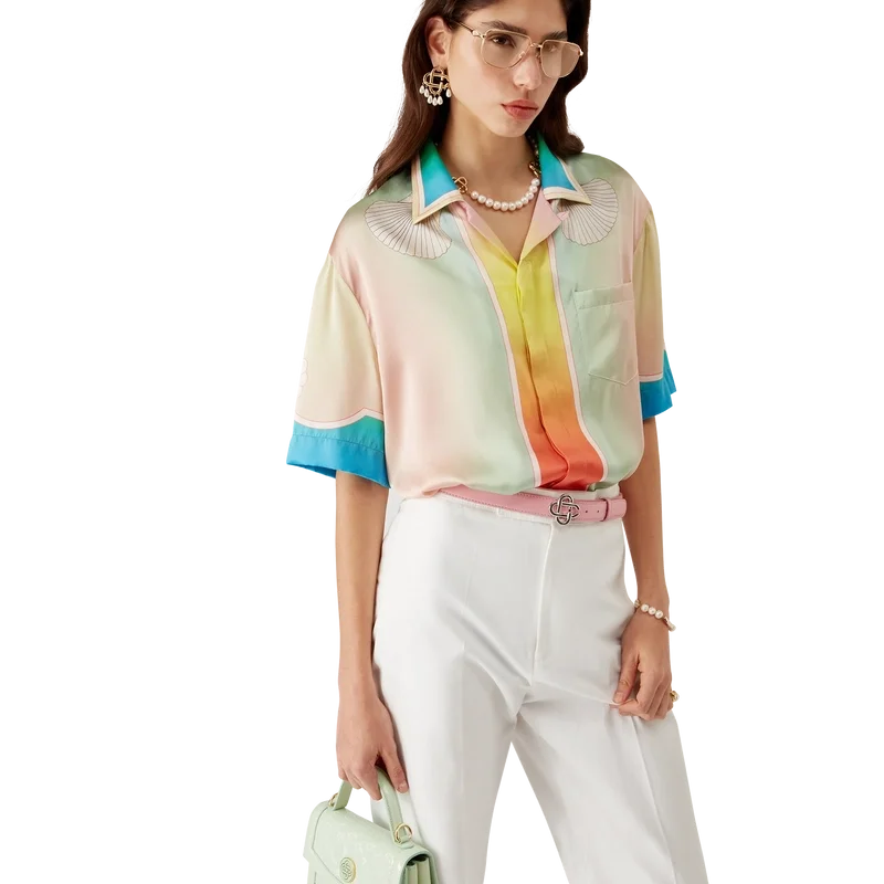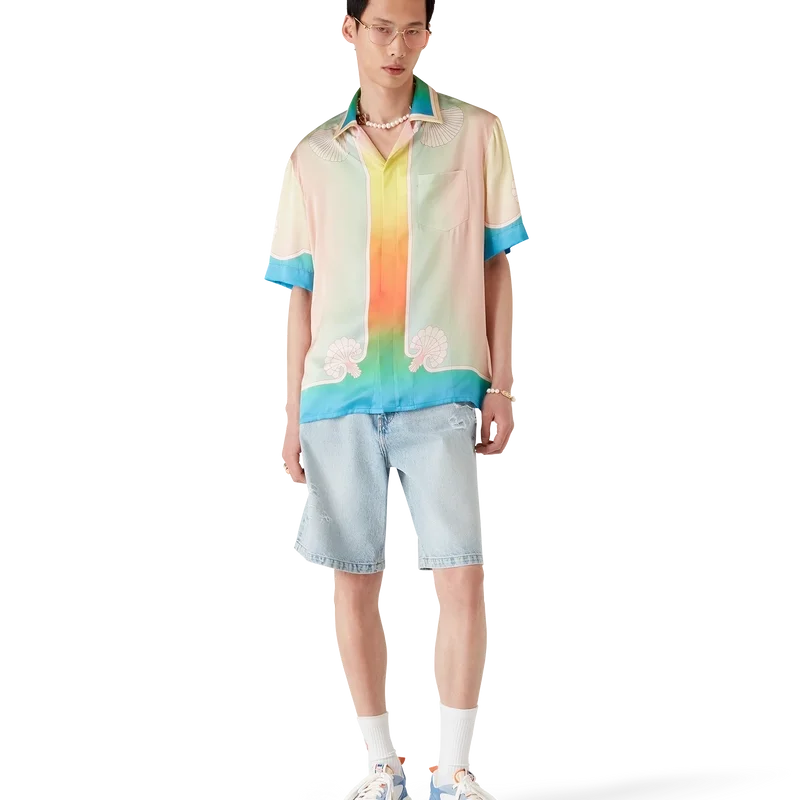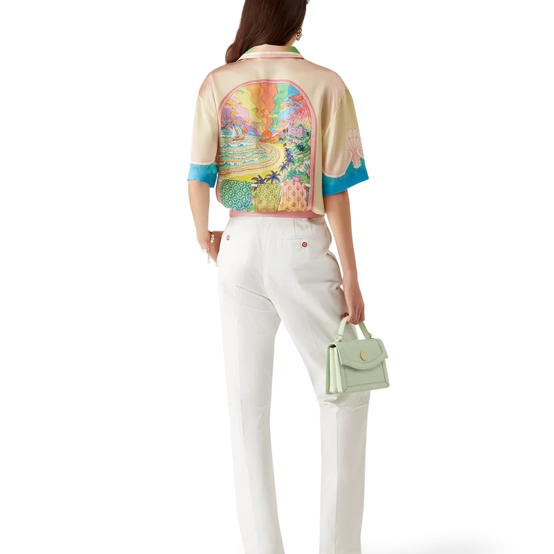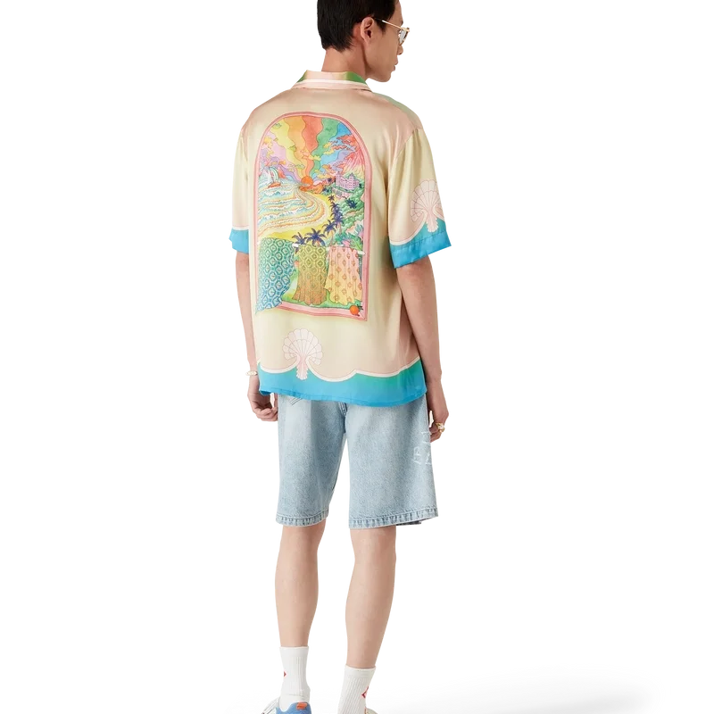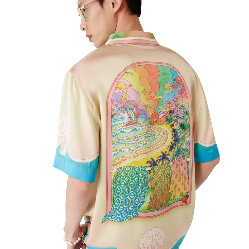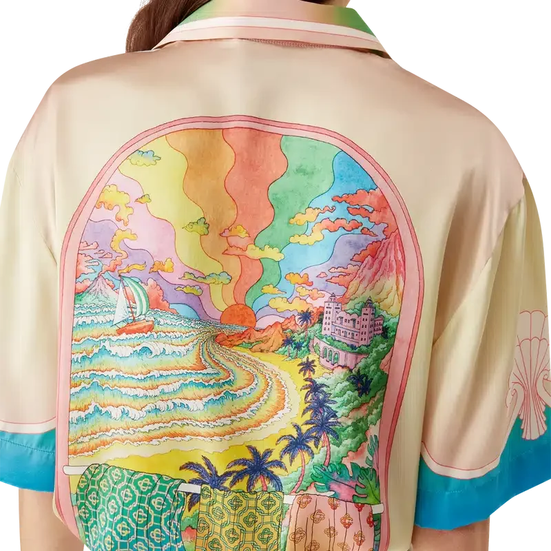Das Lucid Dreams Seidenhemd mit kurzen Ärmeln ist ein durchgehend bedrucktes Design mit dem charakteristischen Kunstwerk des Hauses – in leuchtenden Farben, das einen imaginären Blick durch ein Bogenfenster darstellt – gefertigt aus Seidensatin. Abgerundet durch einen Kubanischen Kragen, verdeckte Knopfleiste, Corozo-Knöpfe mit ineinander verschlungenem Cc-Logo, eine Brusttasche sowie einen Farbverlauf in Regenbogenfarben an Kragen, Knopfleiste, Manschetten und Saum.