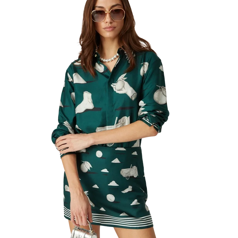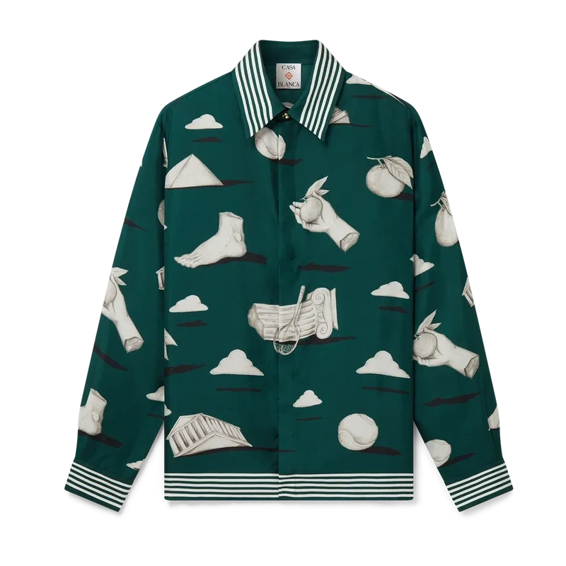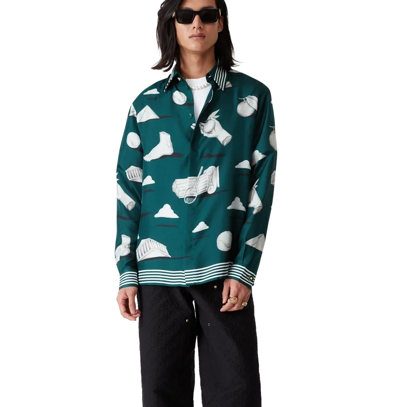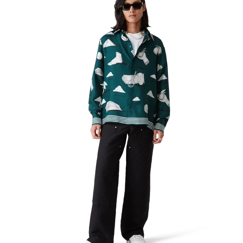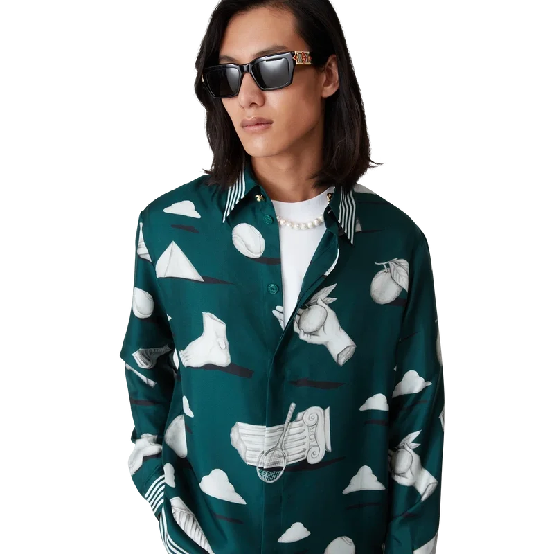 Das Metaphysical Seidenhemd ist ein durchgehend bedrucktes Design, gefertigt aus Seidentwill, mit Kunstwerken, die zentrale Designelemente darstellen. Abgerundet durch charakteristische goldrandige Emailleknöpfe an Manschetten und Kragen, einen Knopfverschluss vorne mit ineinandergreifenden Cc-Corozo-Knöpfen, einen Spitzkragen sowie Streifendetails an Kragen, Manschetten und Saum.