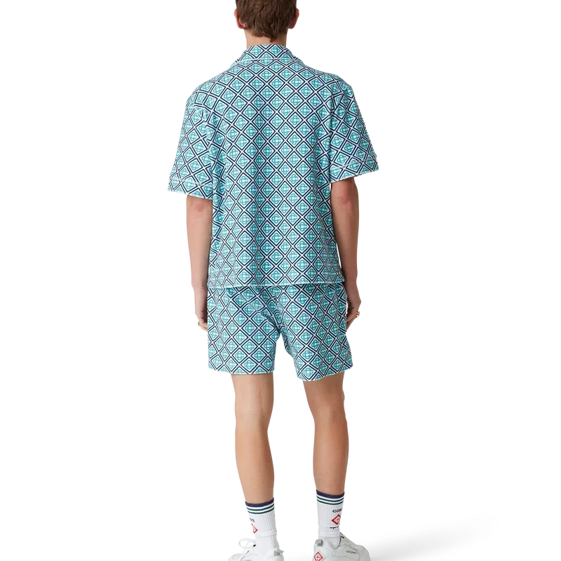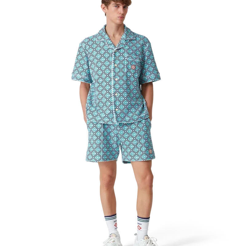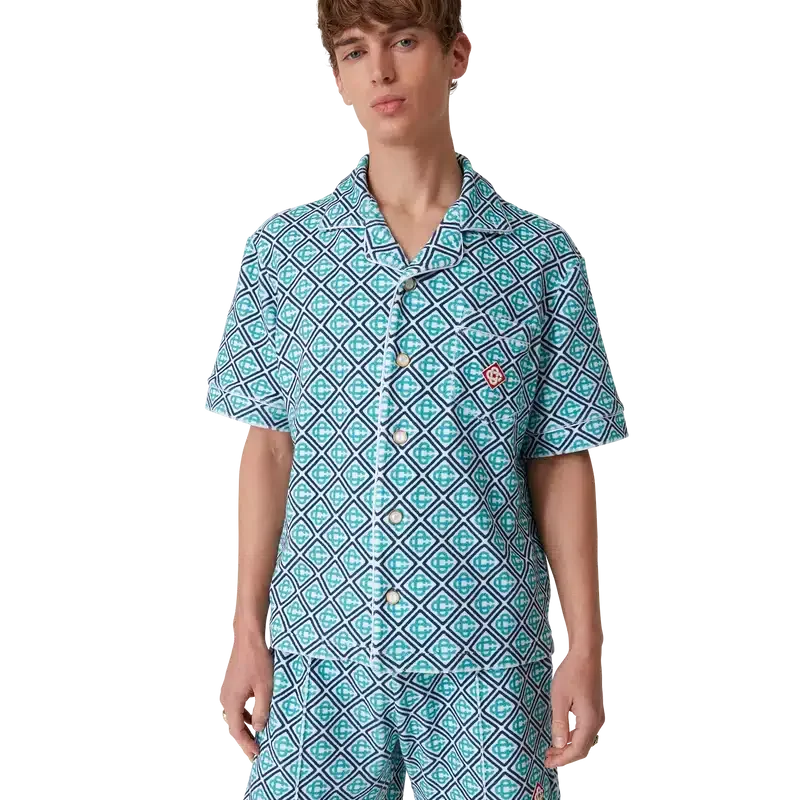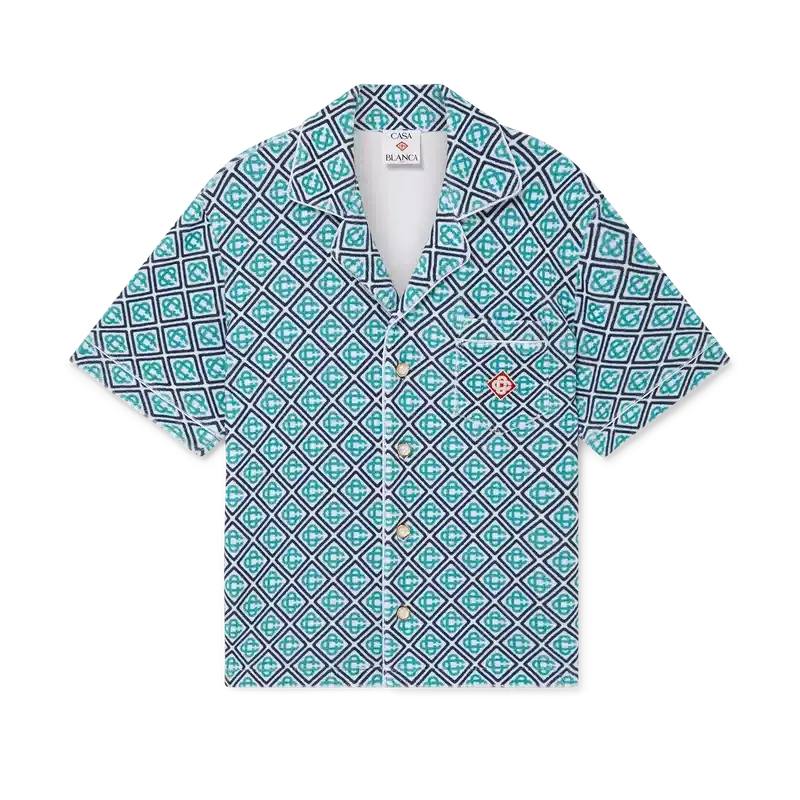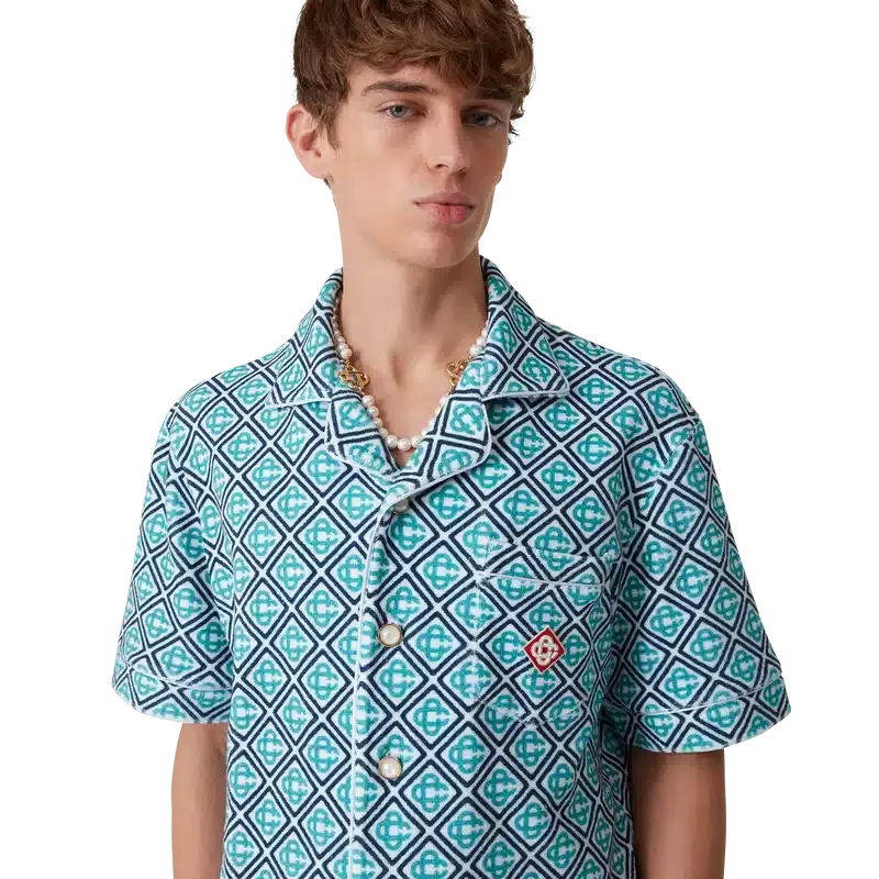 Das Monogram-Frottee-Hemd ist ein kurzärmeliges Modell aus Monogram-Frottee mit einem Monogram-Farbverlauf, der eine neue Interpretation des charakteristischen Casablanca-Prints darstellt. Abgerundet wird es durch einen Knopfverschluss, charakteristische goldgerahmte Perlmuttknöpfe, eine Brusttasche sowie Paspeldetails an Kragen, Knopfleiste, Manschetten und Tasche.