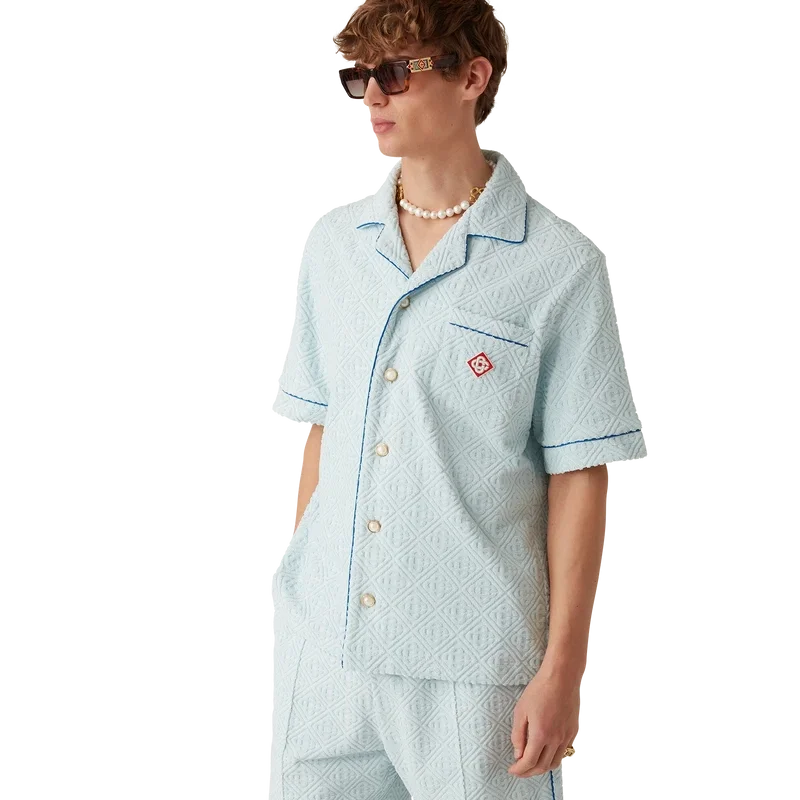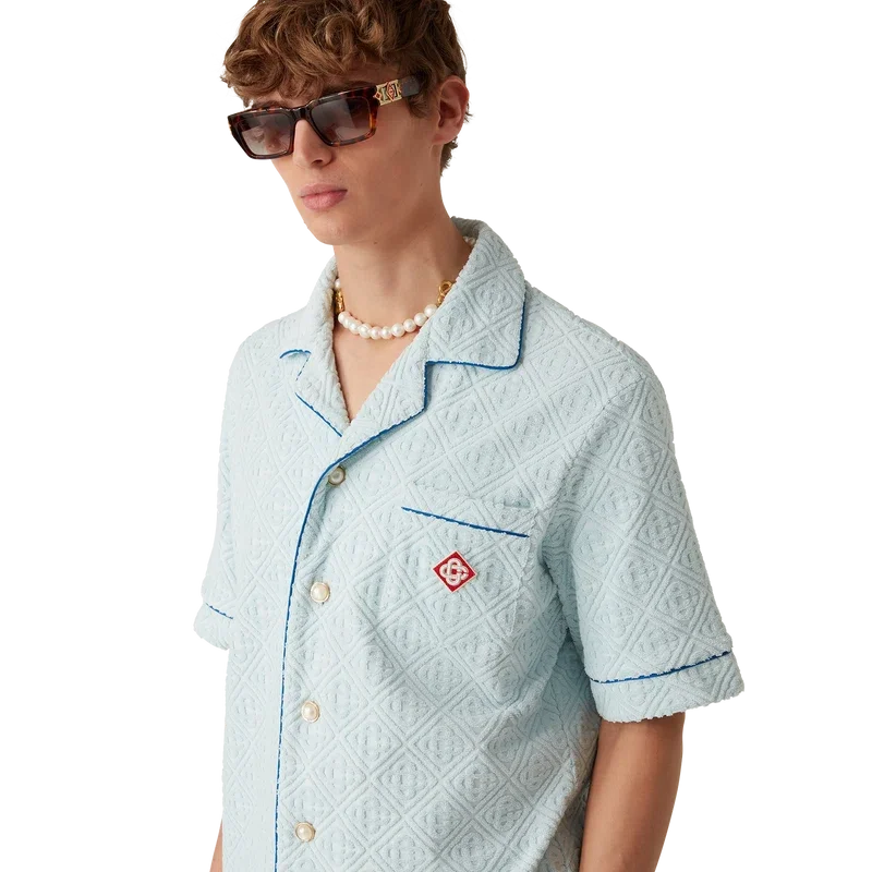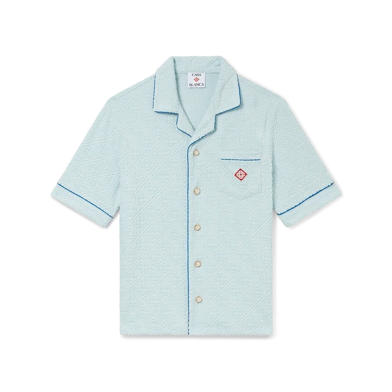 Das Monogram-Frotteehemd ist ein kurzärmeliges Modell aus einem Monogram-Frotteestoff aus Baumwollmischung und ziert das charakteristische Rautenlogo des Hauses. Abgerundet wird es durch eine Brusttasche, Kontrastpaspeln, goldgeränderte Perlmuttknöpfe und einen Kubanerkragen.