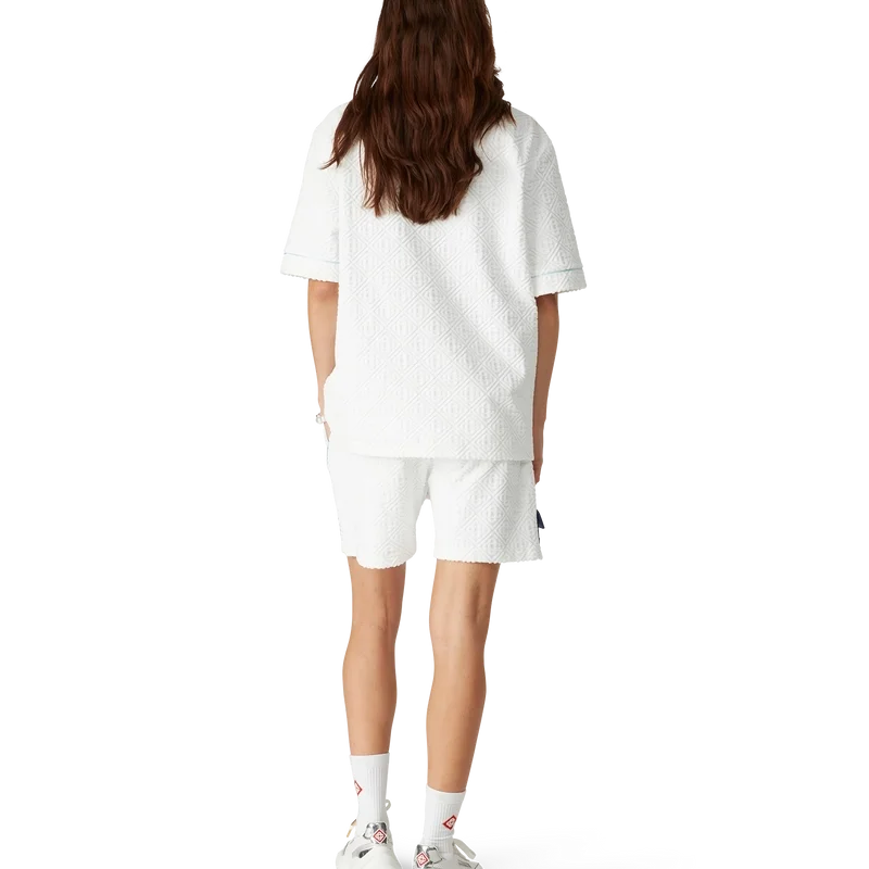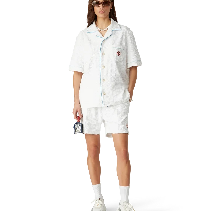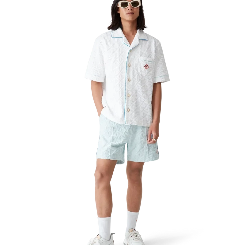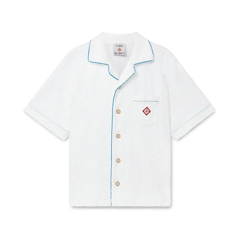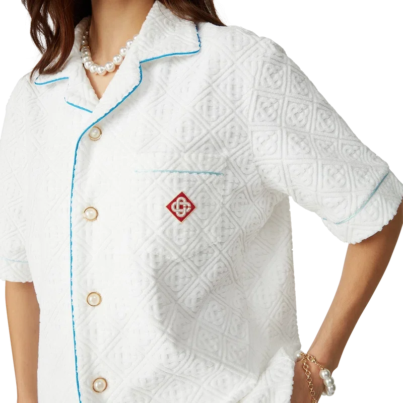 Das Monogram-Frotteehemd ist ein kurzärmeliges Modell aus einem Monogram-Frotteestoff aus Baumwollmischung und ziert das charakteristische Rautenlogo des Hauses. Abgerundet wird es durch eine Brusttasche, Kontrastpaspeln, goldgeränderte Perlmuttknöpfe und einen Kubanerkragen.