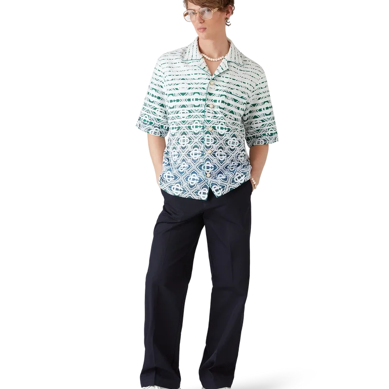 Das Monogram Gradient Frottee-Hemd ist ein kurzärmeliges, weich strukturiertes Modell mit Print und klassischer Silhouette, gefertigt aus einem Frottee-Stoff mit Farbverlauf und dem charakteristischen Diamond Monogram des Hauses. Abgerundet durch einen Knopfverschluss, eine Brusttasche und einen Kubanerkragen.