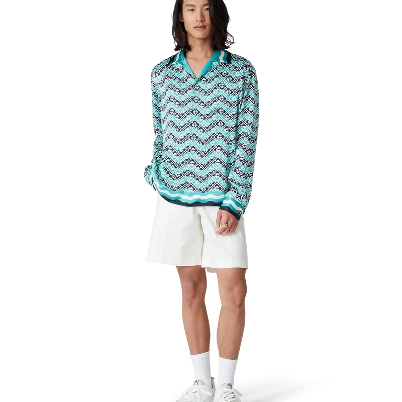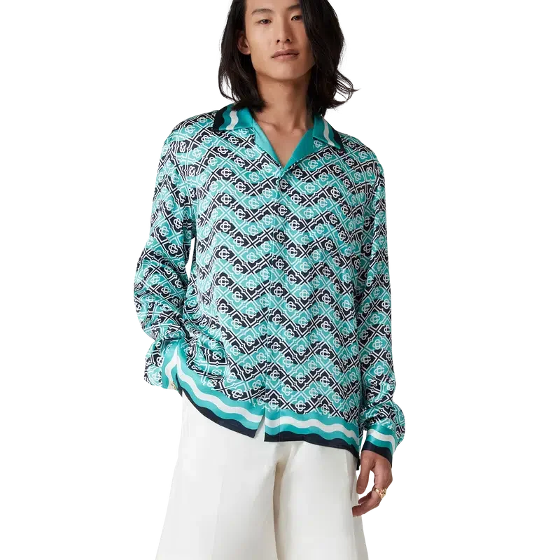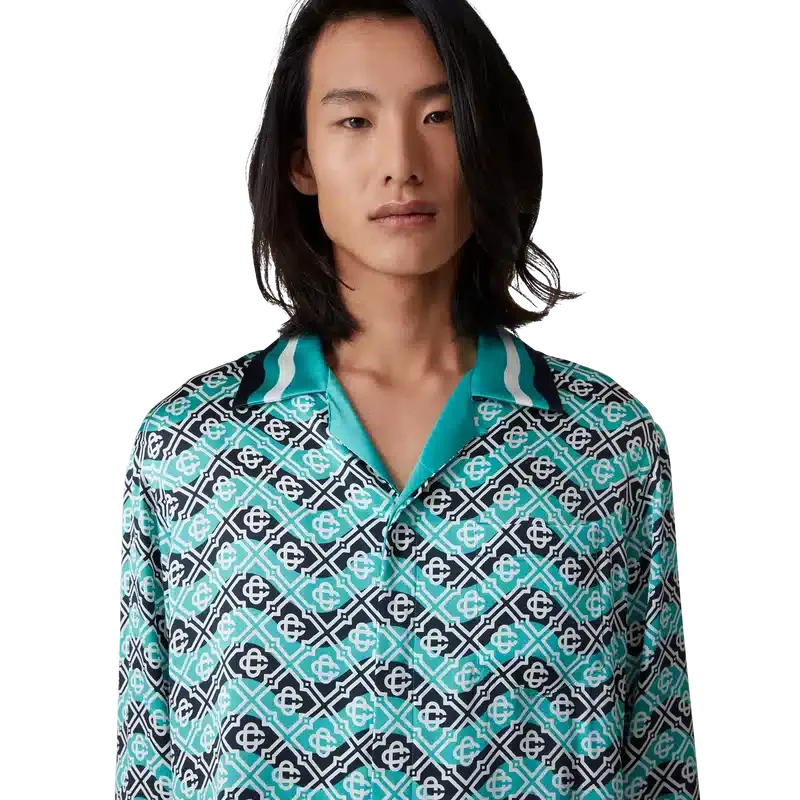 Das Monogram Wave Seidenhemd ist ein durchgehend bedrucktes Modell mit dem charakteristischen Monogramm des Hauses, gefertigt aus Seidensatin. Es verfügt über eine Knopfleiste vorne mit ineinander verschlungenen Cc-Corozo-Knöpfen, goldrandige Emaille-Knöpfe an den Manschetten, einen kubanischen Kragen sowie von der Memphis-Welle inspirierte Streifendetails an Kragen, Manschetten und Saum.