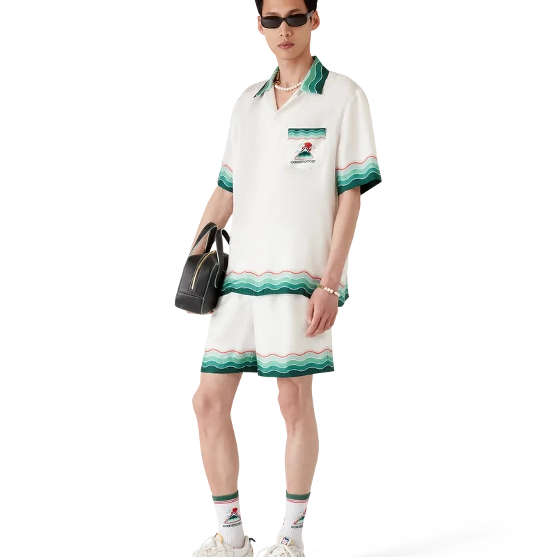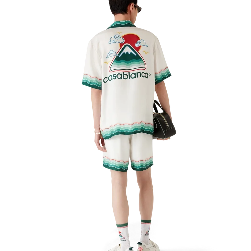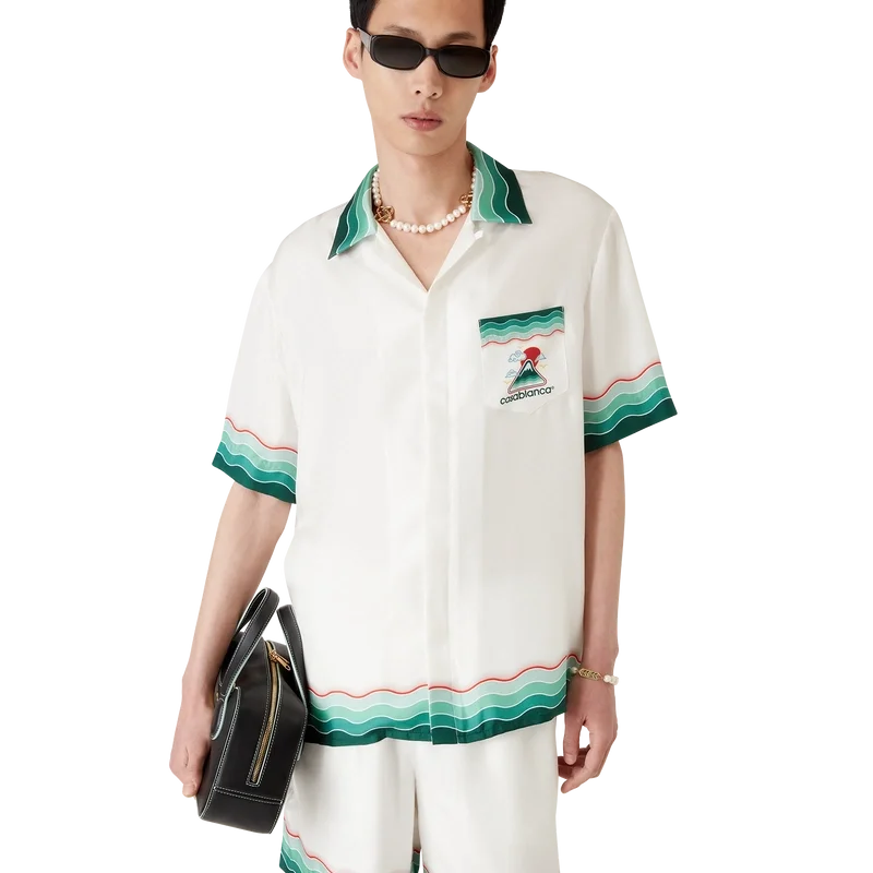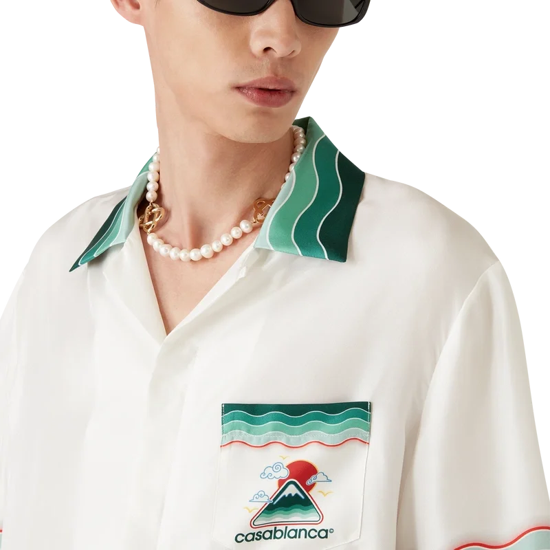 Das Montagne Ondulee Seidenhemd ist ein kurzärmeliges Modell mit Allover-Print, das das saisonale Design des Hauses zeigt – inspiriert von Japans reichhaltiger Ikonografie, vermittelt es mit seinem schlichten Layout und den Motiven eine starke visuelle Botschaft mit nur wenigen Linien und Farben und ist damit eines der Aushängeschilder der Kollektion – gefertigt aus Seidentwill. Abgerundet durch einen Kubanerkragen, verdeckte Knopfleiste, Corozo-Knöpfe mit ineinander verschlungenem Cc-Logo sowie von der Memphis-Welle inspirierte Streifenverzierungen an Kragen, Manschetten und Saum.