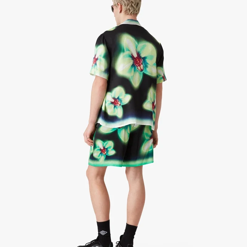 Das Glitch Orchid Kurzarm-Seidenhemd ist ein durchgehend bedrucktes Design mit einem Motiv, das die kontrastreiche Designphilosophie der Schnittstelle zwischen Natur und Menschhaftem verkörpert, indem es die natürliche Schönheit der Orchideenblüte zeigt. Abgerundet wird das Design durch einen Kragen im kubanischen Stil, einen Knopfverschluss, Corozo-Knöpfe mit ineinander verschlungenem Cc-Logo, eine Brusttasche, das Casablanca-Logo des Hauses sowie Kantenverzierungen an Kragen, Manschetten und Saum.