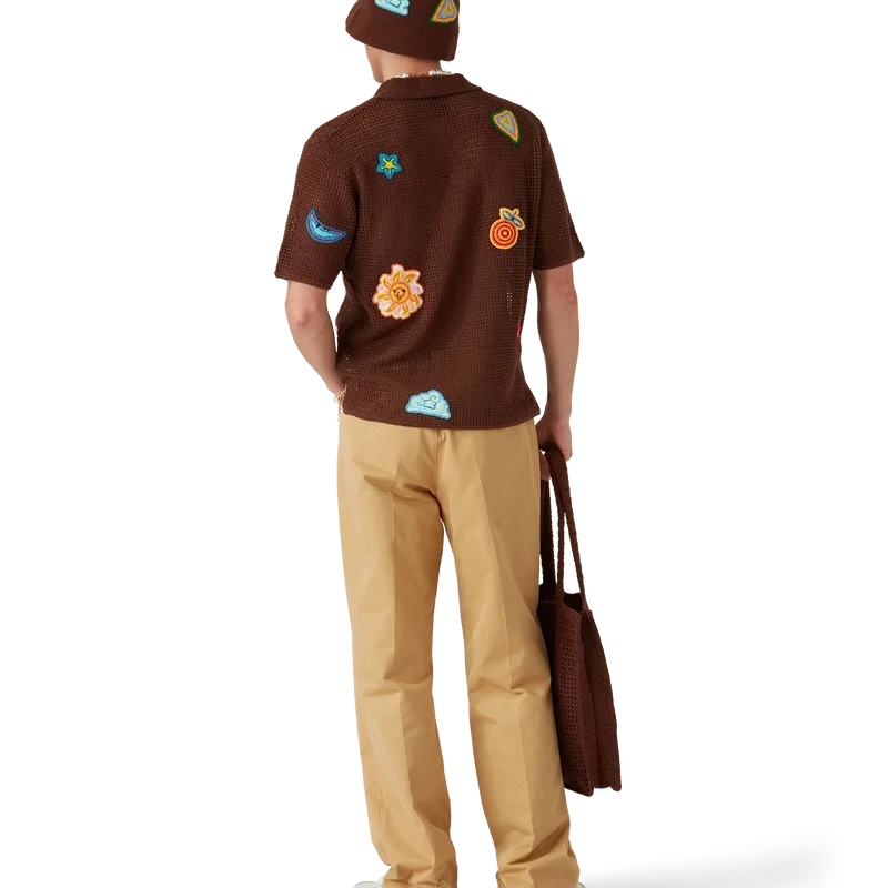 Das Poloshirt mit Häkelmotiv ist ein kurzärmeliges Modell aus gestricktem, merzerisiertem Baumwollstoff. Abgerundet durch Motive der klassischen Designelemente des Hauses, charakteristische Perlenknöpfe mit Goldrand sowie einen gerippten Kragen und Manschetten.