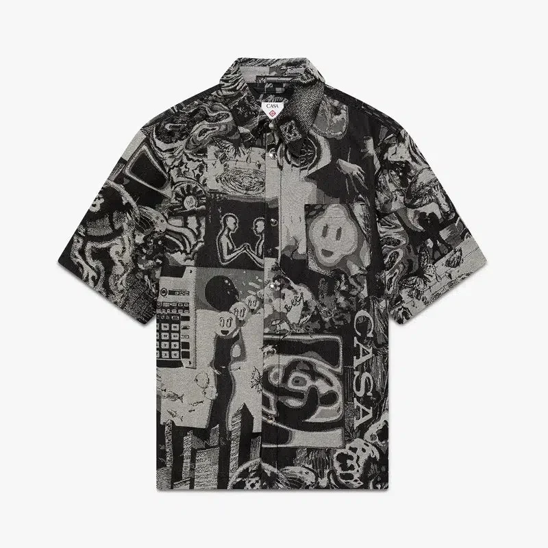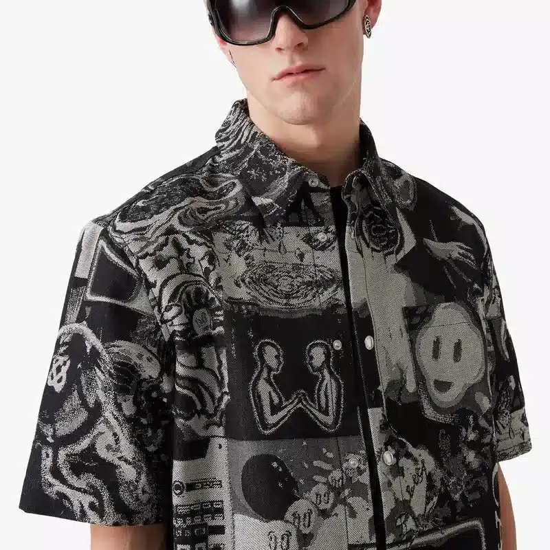 Das Rave Collage Kurzarm-Jeanshemd ist ein raffiniertes Design aus Jacquard-Denim-Stoff mit saisonalen Motiven, die eine chaotische Sammlung von Rave-Flyern und Symbolen interpretieren, die durch die Jacquard-Denim-Webart in eine körnige Textur übertragen werden. Abgerundet durch einen Kragen im kubanischen Stil, Knopfleiste, versilberte Knöpfe und eine Brusttasche.