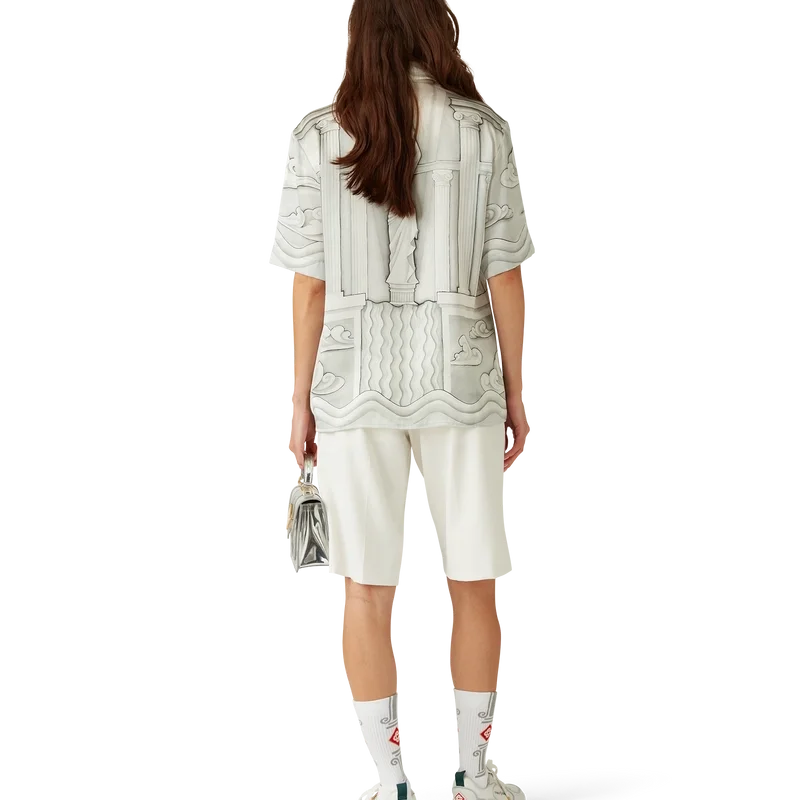Das Seidenhemd „Sacred Stone“ ist ein kurzärmeliges Modell mit Allover-Print aus Seidensatin, das mit dem saisonalen Kunstwerk des Hauses verziert ist, inspiriert vom Steineffekt des Trompe-l’œil mit leichten Zeichnungen. Abgerundet durch einen Kubanerkragen, einen Knopfverschluss und ineinander verschlungene CC-Logo-Knöpfe aus Corozo<!–