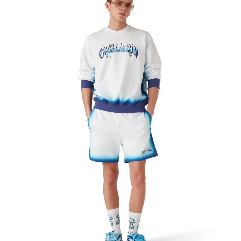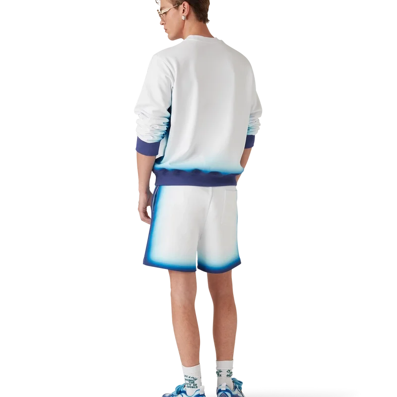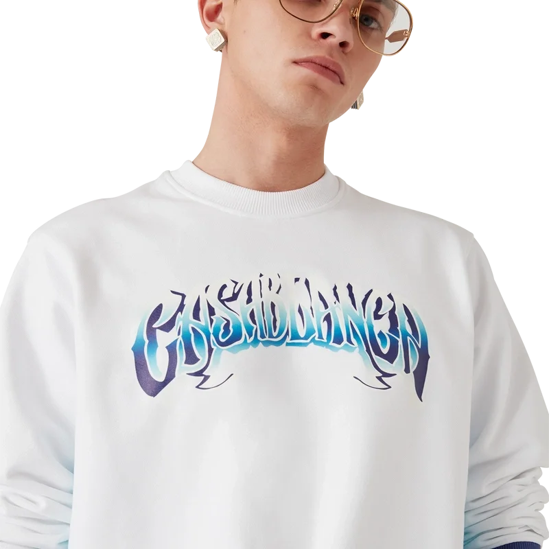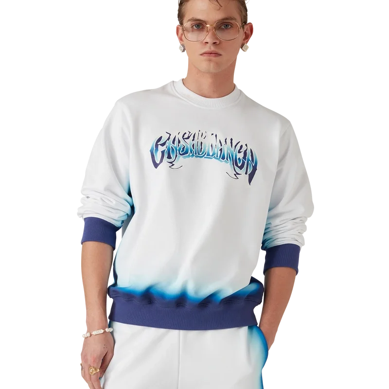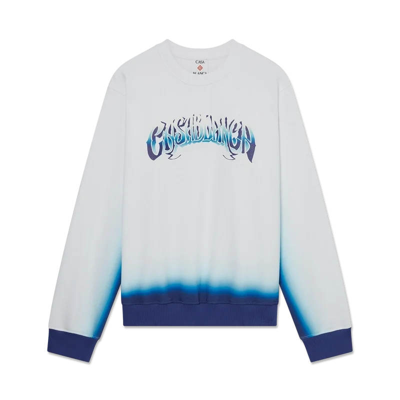 Das Blue Fade Sweatshirt ist ein Langarm-Modell mit dem Casablanca-Logo des Hauses in einer handgezeichneten Schriftart, die von der in Tattoos verwendeten gotischen Schrift inspiriert ist, gefertigt aus Baumwollstoff. Abgerundet durch einen klassischen gerippten Rundhalsausschnitt, kontrastierende gerippte Bündchen und Saum sowie blau bedruckte Nähte an den Ärmeln und an den Seiten.