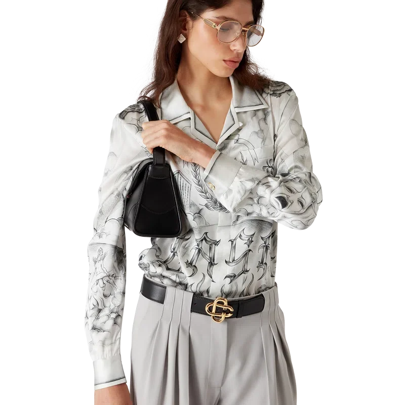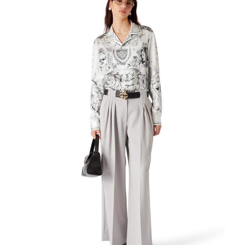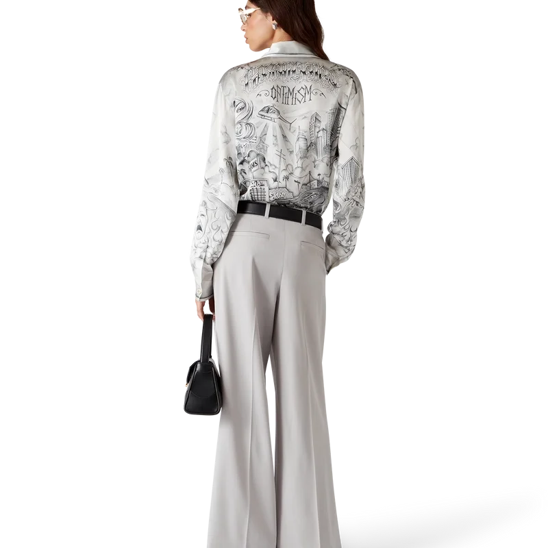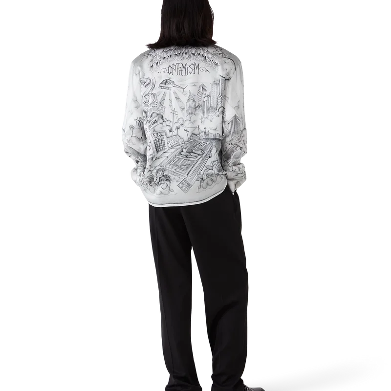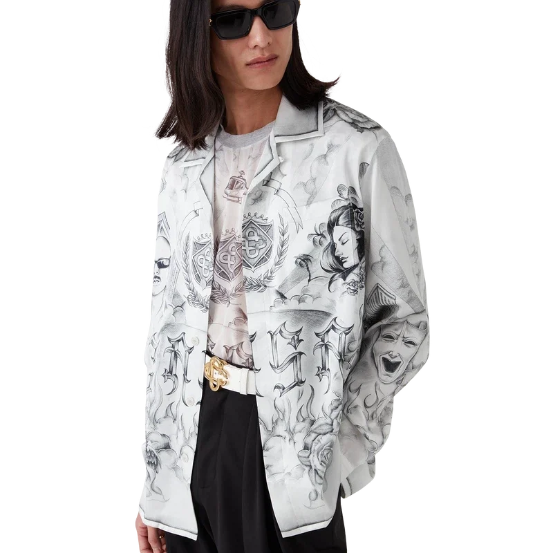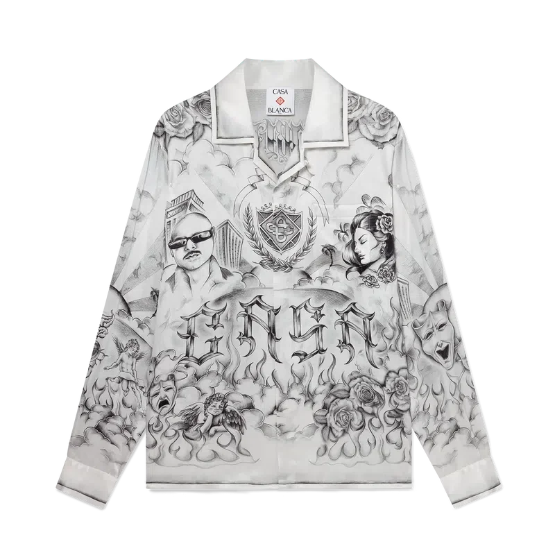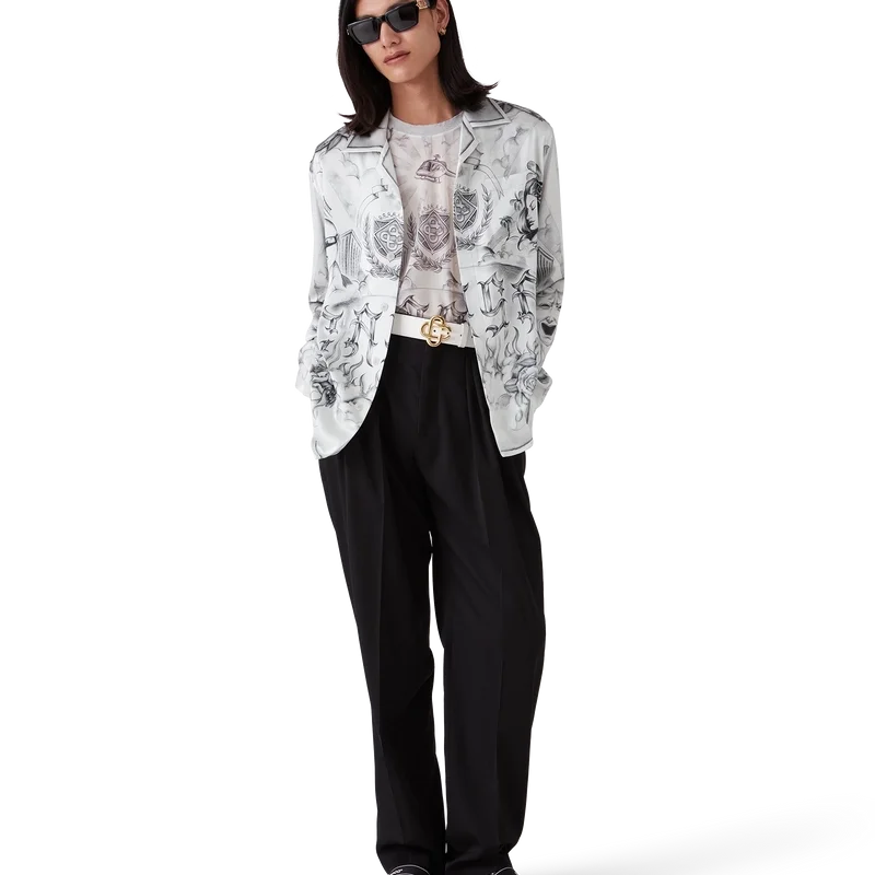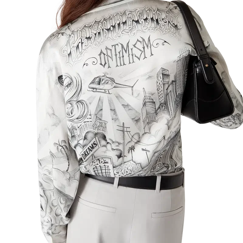 Das Tattoo-Seidenhemd ist ein Langarm-Modell aus bedrucktem Seidensatin mit dem Artwork der Saison, inspiriert von der Nachbarschaftsszene von La, das auf die reiche Tattoo-Kultur und die grauen und schwarzen Tinten verweist, die bei diesen Tattoos verwendet werden.