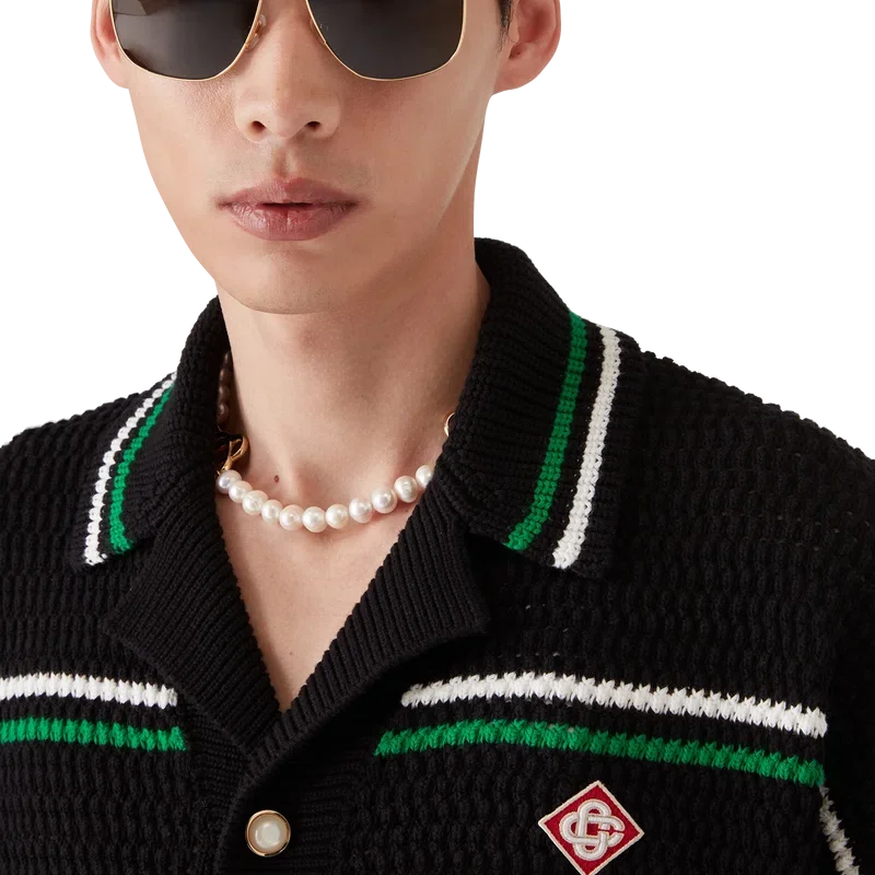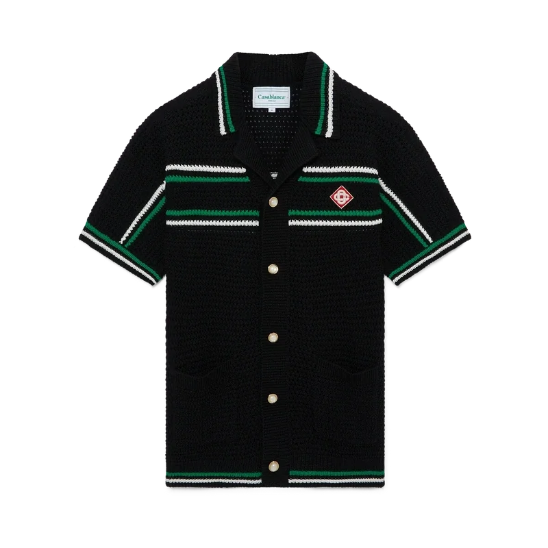 Das Tennis-Häkelhemd ist ein kurzärmeliges, strukturiertes Design aus einem gehäkelten Bio-Baumwollstoff und verfügt über das charakteristische Rautenlogo des Hauses. Abgerundet durch einen gerippten Kragen, Ärmelbündchen, Saum und Knopfleiste, aufgesetzte Taschen vorne, charakteristische goldgeränderte Perlknöpfe, Knopfverschluss vorne sowie grün-weiße Streifenverzierungen auf Brust, Rücken, Ärmeln, Ärmelbündchen, Saum und Kragen.
