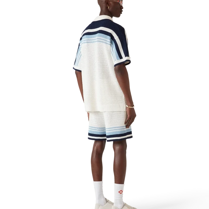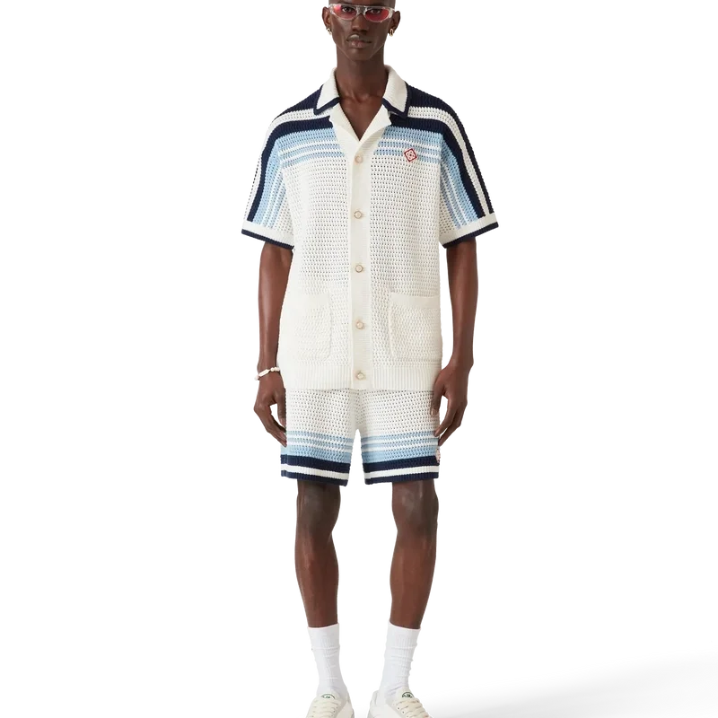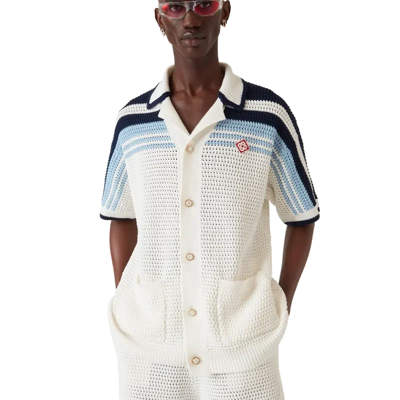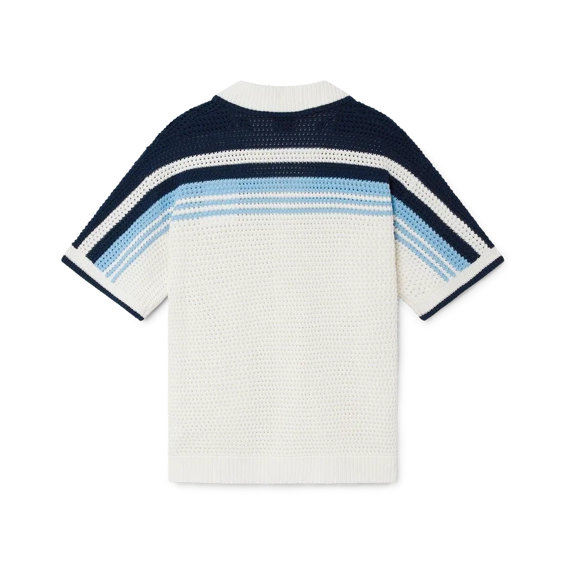 Das Häkelhemd ist ein raffiniertes, klassisches Design aus einem gehäkelten Baumwollstoff mit dem charakteristischen Tennisstreifen-Design über Schultern, Brust und Ärmeln in Naturfarben, die einen Farbverlaufseffekt bilden. Mit geripptem Kragen, Manschetten und Saum, Knopfleiste vorne, aufgesetzten Taschen vorne, charakteristischen golden umrandeten Perlknöpfen und einer lockeren Silhouette.