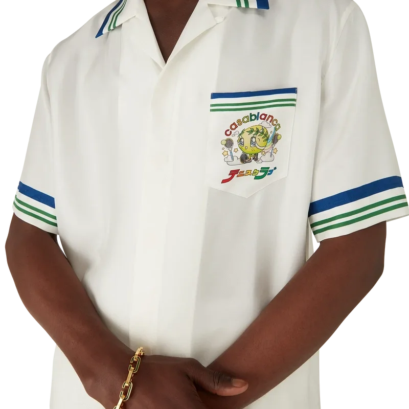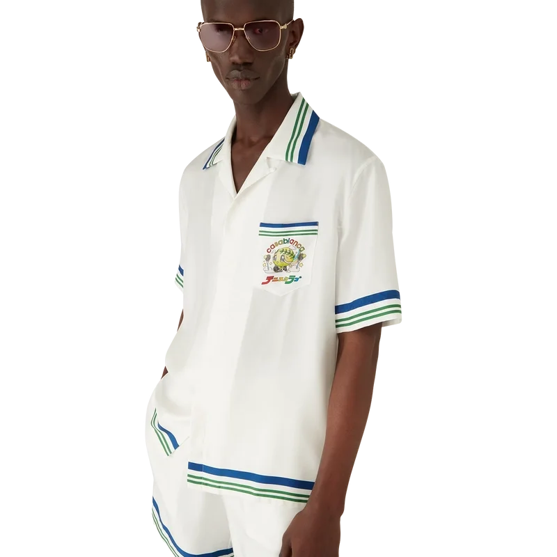 Das Tennis-Maskottchen-Shorts-Hemd aus Seidentwill ist ein bedrucktes Design mit saisonalen Motiven des Kawaii-Tennisballs – diese Figur ist ein zentraler Bestandteil unseres Universums. Es vereint Elemente wie das Lorbeerblatt, den Atlantis-Sneaker, den Schläger und die Kawaii-Augen. Wir haben uns dafür entschieden, diese Figur als zentrales Motiv für alle Herrenmodelle der Kollektion zu verwenden. Abgerundet wird das Design durch einen Kubanerkragen, einen Knopfverschluss, Corozo-Knöpfe mit dem ineinander verschlungenen Cc-Logo, eine Brusttasche sowie blau-weiß-grüne Streifen an Kragen, Manschetten, Saum und Tasche.