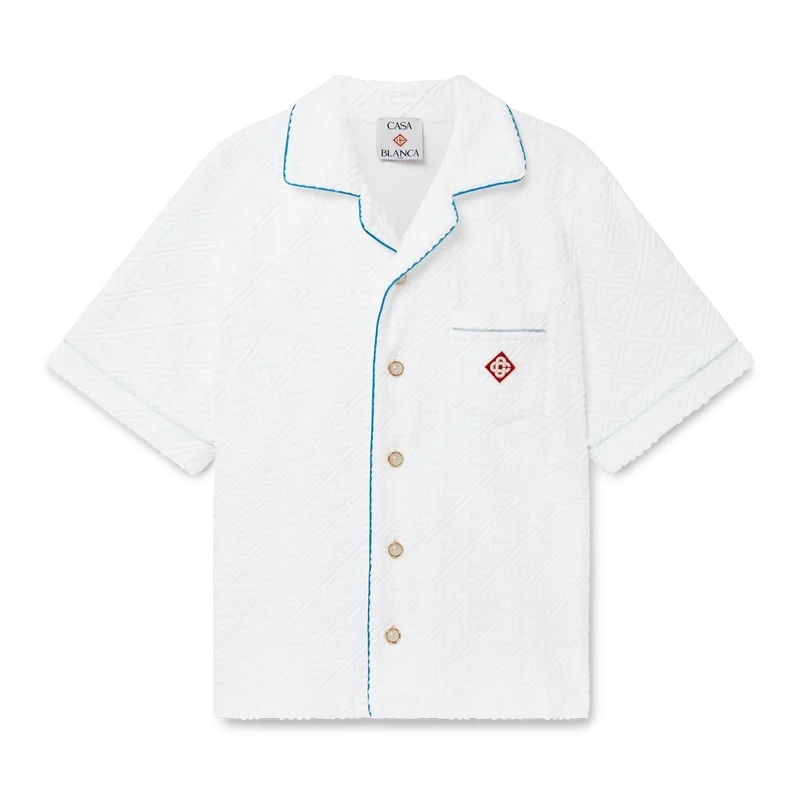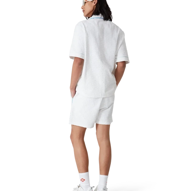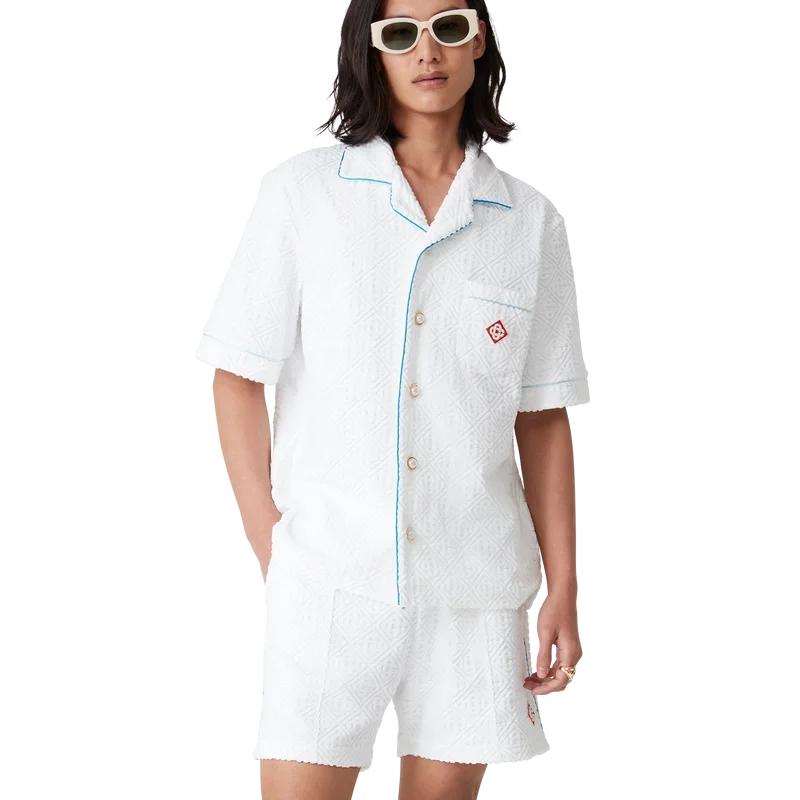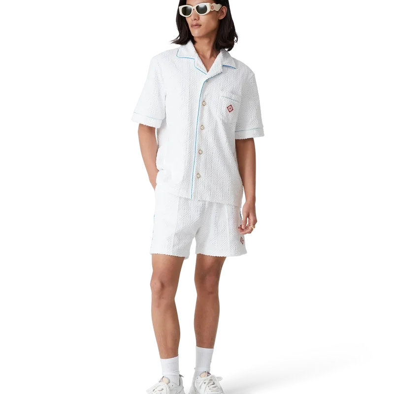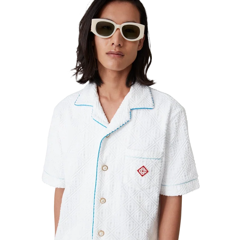 Das Tennis Stripe Frottee-Hemd ist ein kurzärmeliges Modell aus Monogram-Frottee mit dem Diamant-Logo des Hauses. Es verfügt über einen Knopfverschluss, die charakteristischen goldgerahmten Perlmuttknöpfe des Hauses, eine Brusttasche sowie Paspeldetails an Kragen, Ärmeln, Brusttasche und Knopfleiste.