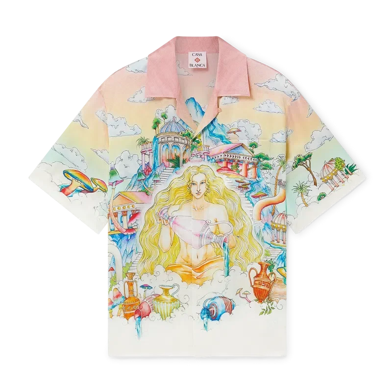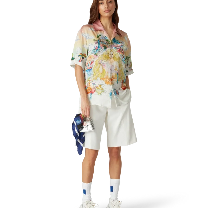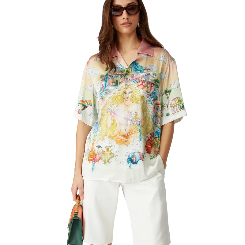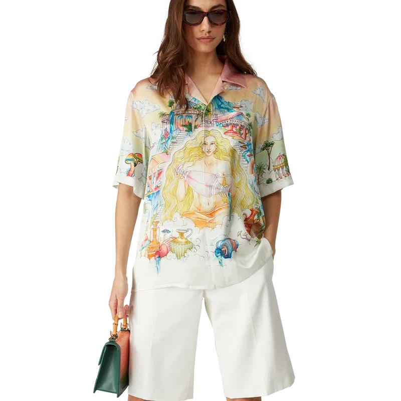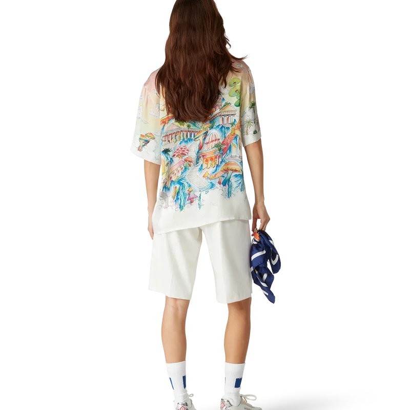 Das Seidenhemd „The Road to Knowledge“ ist ein kurzärmeliges Modell mit Allover-Print aus Seidensatin, das mit dem saisonalen Kunstwerk des Hauses verziert ist – eine Hommage an den Mythos von Eleusis, einem Ritual aus der Antike, bei dem sich Denker, Architekten und Künstler jener Zeit vereinte. Dort nahmen sie einen Trank zu sich und erweiterten ihren Geist – das Kunstwerk zeigt einen Berg voller Kontrollpunkte. Abgerundet durch einen kubanischen Kragen, ineinander verschlungene Cc-Corozo-Knöpfe, einen Knopfverschluss vorne und eine Brusttasche.