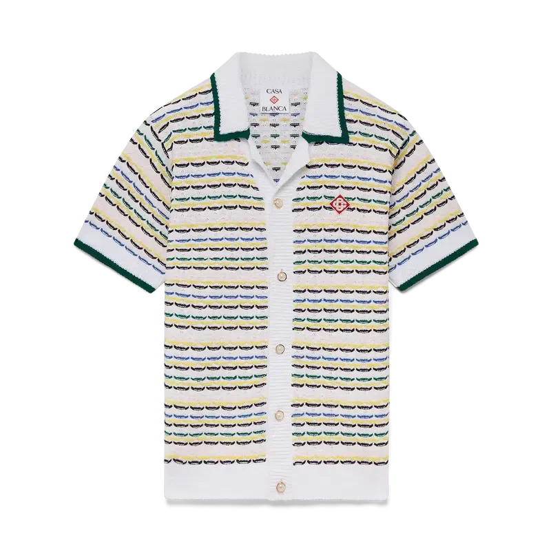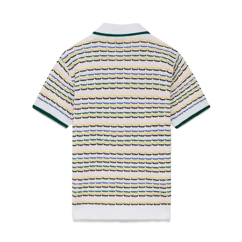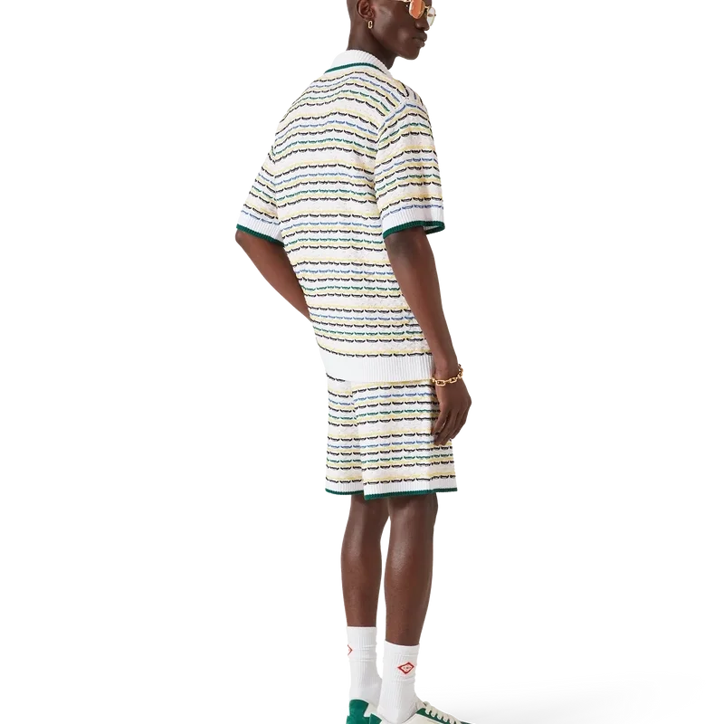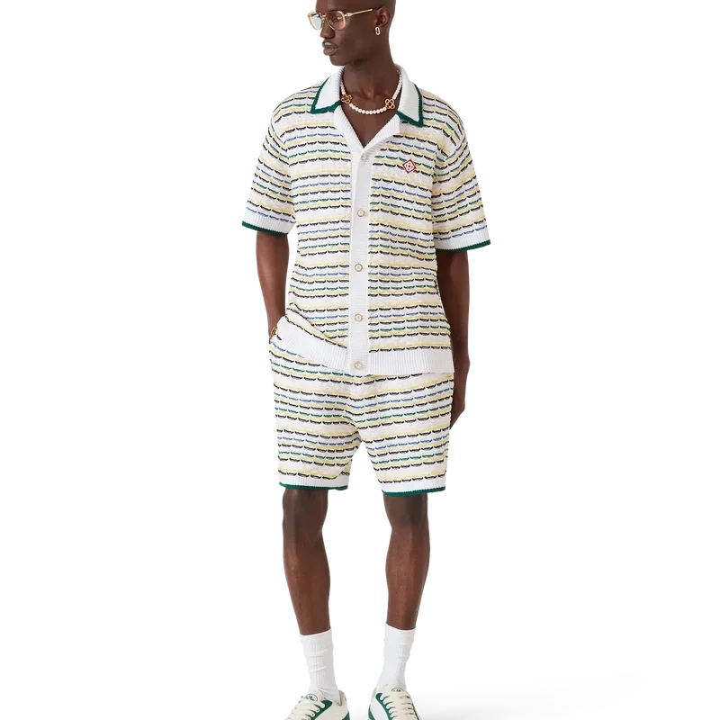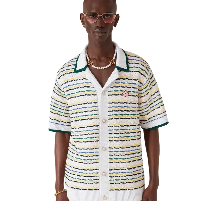 Das Tuck-Stitch-Hemd ist ein kurzärmeliges Strickmodell mit dem charakteristischen Rautenlogo des Hauses. Abgerundet durch einen Kragen im kubanischen Stil, Knopfverschluss, charakteristische goldgeränderte Perlknöpfe sowie gerippte Details an Kragen, Manschetten, Saum und Knopfleiste. Entworfen, um mit den passenden Tuck-Stitch-Shorts getragen zu werden.