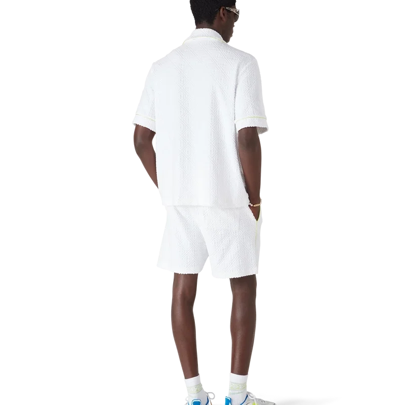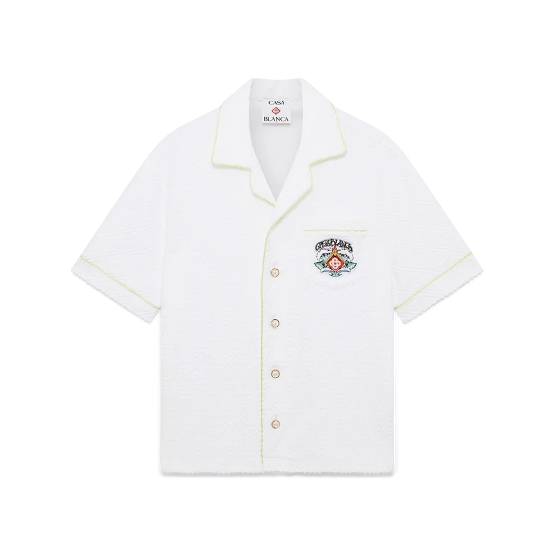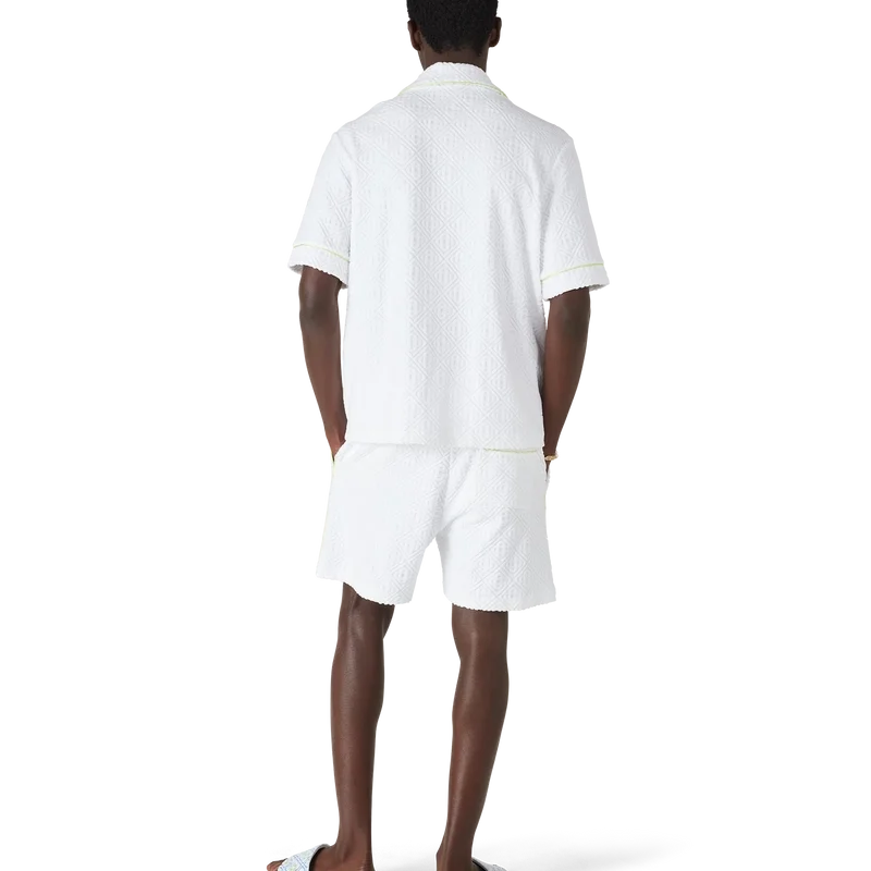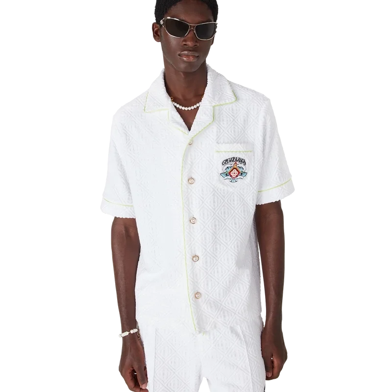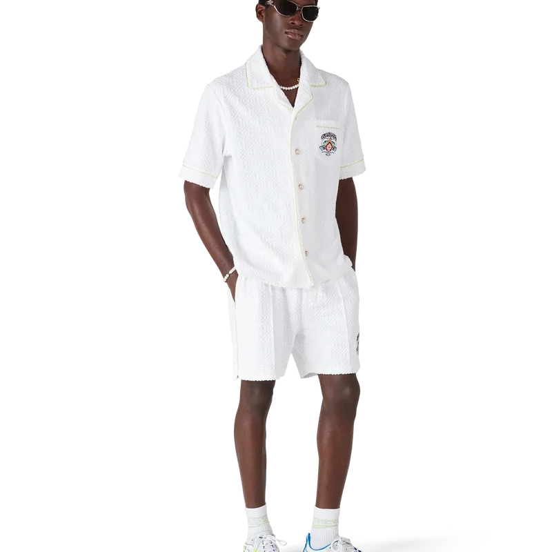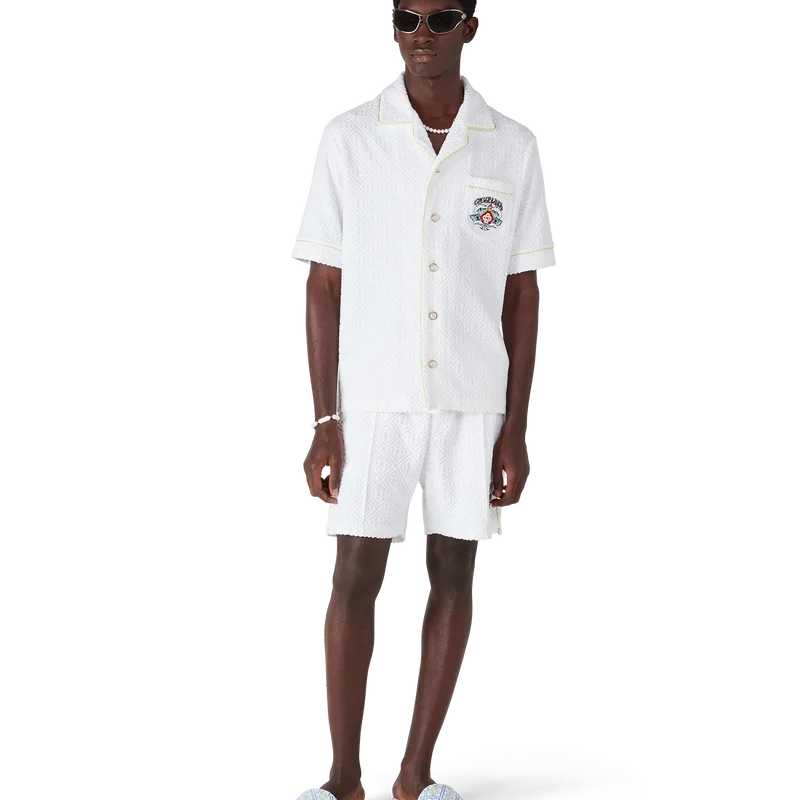 Das Monogram-Frotteehemd ist ein raffiniertes Kurzarm-Design mit dem „Innocence“-Motiv der Saison, das eine Meeresszene bei Sonnenuntergang mit einer Insel im Zentrum zeigt, dargestellt in einem Stil, der von klassischer Surf-T-Shirt-Kunst beeinflusst ist. Das Motiv fängt die ätherische Schönheit der goldenen Stunde über tropischen Gewässern ein und präsentiert eine idealisierte Vision eines Strandparadieses durch die raffinierte Sport- und Freizeit-Linse des Hauses. Abgerundet wird das Design durch einen Kragen im kubanischen Stil, eine Brusttasche, einen Knopfverschluss, die charakteristischen goldgerahmten Perlenknöpfe sowie Paspeldetails an Kragen, Manschetten und Knopfleiste.