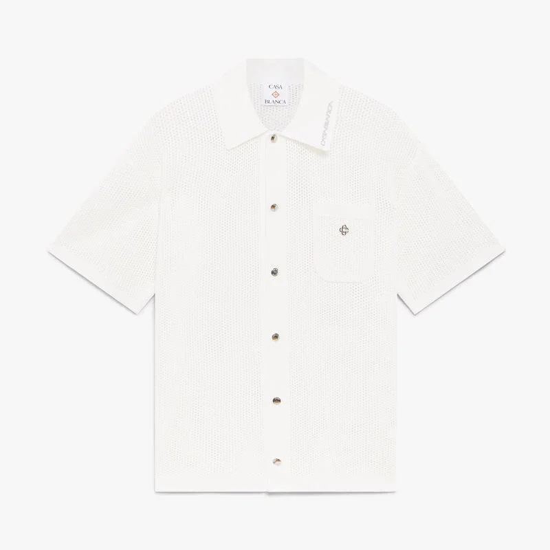 Das weiße Kurzarm-Mesh-Hemd besticht durch sein raffiniertes Design und verkörpert den gehobenen Ansatz des Hauses in Sachen Freizeitmode. Es verfügt über einen Kragen, einen Knopfverschluss, charakteristische goldgeränderte Perlknöpfe sowie eine Brusttasche mit dem Warped-Logo des Hauses.