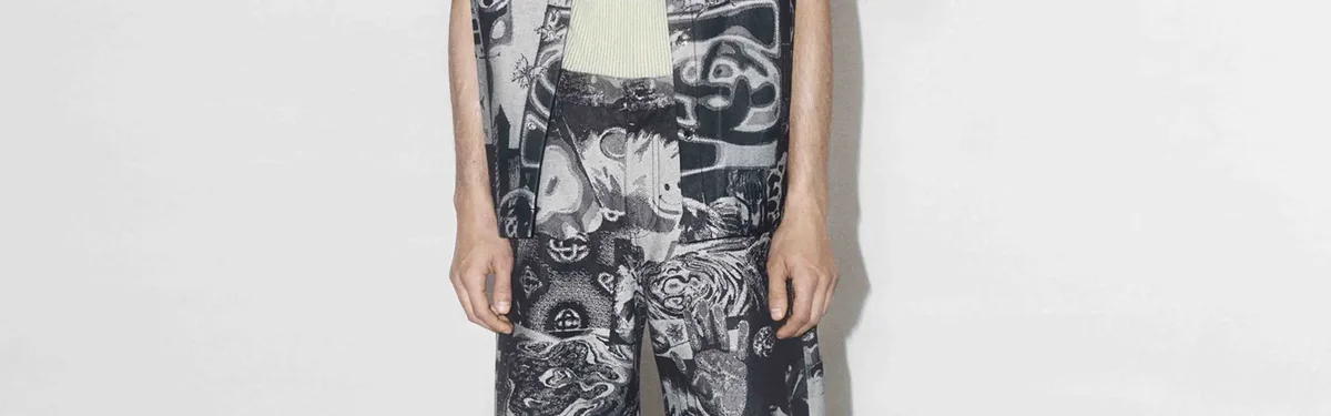 Die Rave Collage Straight Leg Jeans besticht durch ein raffiniertes Design mit saisonalen Motiven, die eine chaotische Sammlung von Rave-Flyern und Symbolen interpretieren, die durch eine Jacquard-Denim-Webart in eine körnige Textur übertragen wurden. Abgerundet durch Gürtelschlaufen, einen Reißverschluss, Vorder- und Gesäßtaschen, ein Futter und versilberte Metallbeschläge.